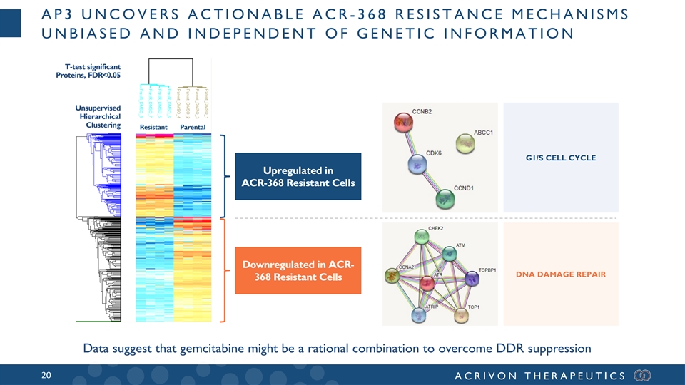 AP3 UNCOVERS ACTIONABLE ACR -368 RESISTANCE MECHANISMS UNBIASED AND INDEPENDENT OF GENETIC INFORMATION T-test significant Proteins, FDR<0.05 Unsupervised Hierarchical Clustering Resistant Parental G1/S CELL CYCLE Upregulated in ACR-368 Resistant Cells Downregulated in ACR- DNA DAMAGE REPAIR 368 Resistant Cells Data suggest that gemcitabine might be a rational combination to overcome DDR suppression 20 ACRIVON THERAPEUTICS