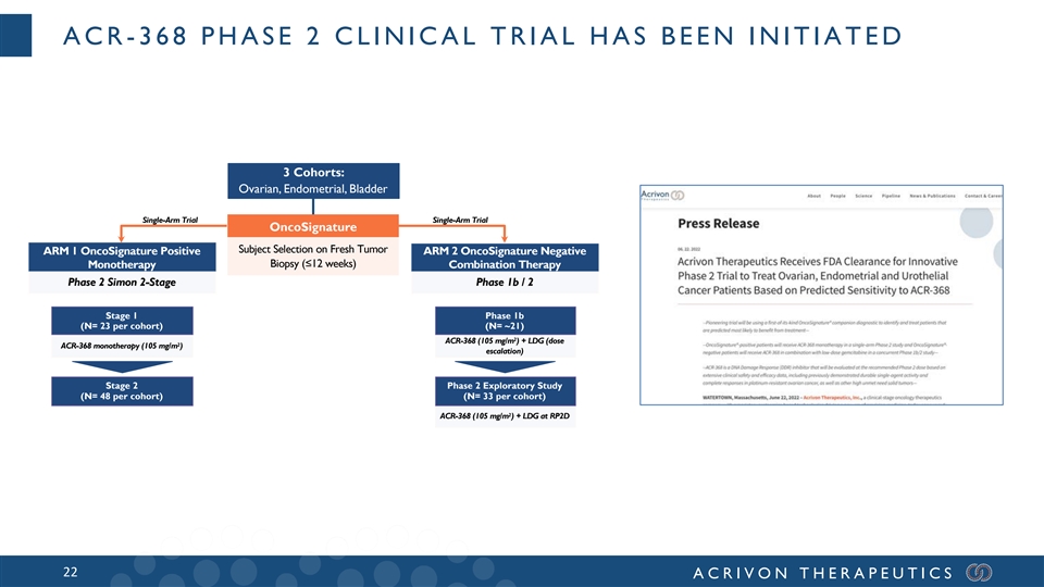 ACR -368 PHASE 2 CLINICAL TRIAL HAS BEEN INITIATED 3 Cohorts: Ovarian, Endometrial, Bladder Single-Arm Trial Single-Arm Trial OncoSignature Subject Selection on Fresh Tumor ARM 1 OncoSignature Positive ARM 2 OncoSignature Negative Monotherapy Biopsy (≤12 weeks) Combination Therapy Phase 2 Simon 2-Stage Phase 1b / 2 Stage 1 Phase 1b (N= 23 per cohort) (N= ~21) 2 ACR-368 (105 mg/m ) + LDG (dose 2 ACR-368 monotherapy (105 mg/m ) escalation) Stage 2 Phase 2 Exploratory Study (N= 48 per cohort) (N= 33 per cohort) 2 ACR-368 (105 mg/m ) + LDG at RP2D 22 ACRIVON THERAPEUTICS