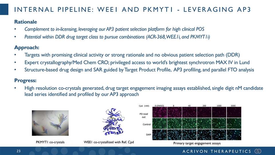 INTERNAL PIPELINE: WEE1 AND PKMYT1 - LEVERAGING AP3 Rationale • Complement to in-licensing, leveraging our AP3 patient selection platform for high clinical POS • Potential within DDR drug target class to pursue combinations (ACR-368, WEE1i, and PKMYT1i) Approach: • Targets with promising clinical activity or strong rationale and no obvious patient selection path (DDR) • Expert crystallography/Med Chem CRO; privileged access to world’s brightest synchrotron MAX IV in Lund • Structure-based drug design and SAR guided by Target Product Profile, AP3 profiling, and parallel FTO analysis Progress: • High resolution co-crystals generated, drug target engagement imaging assays established, single digit nM candidate lead series identified and profiled by our AP3 approach 0 (DMSO) 8 40 200 1000 5000 Cpd. (nM): PD read out Control DAPI PKMYT1 co-crystals WEE1 co-crystallized with Ref. Cpd Primary target engagement assays 23 ACRIVON THERAPEUTICS