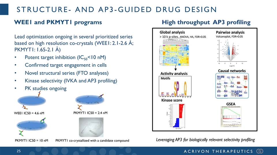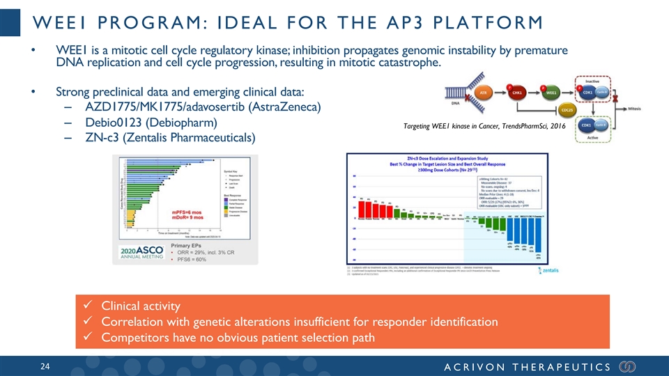 WEE1 PROGRAM: IDEAL FOR THE AP3 PLATFORM • WEE1 is a mitotic cell cycle regulatory kinase; inhibition propagates genomic instability by premature DNA replication and cell cycle progression, resulting in mitotic catastrophe. • Strong preclinical data and emerging clinical data: – AZD1775/MK1775/adavosertib (AstraZeneca) – Debio0123 (Debiopharm) Targeting WEE1 kinase in Cancer, TrendsPharmSci, 2016 – ZN-c3 (Zentalis Pharmaceuticals) ü Clinical activity ü Correlation with genetic alterations insufficient for responder identification ü Competitors have no obvious patient selection path 24 ACRIVON THERAPEUTICS