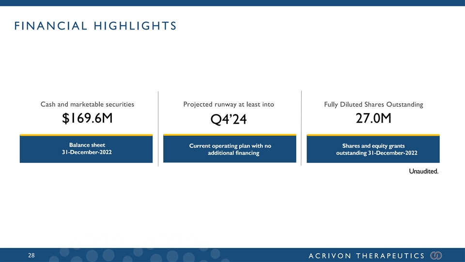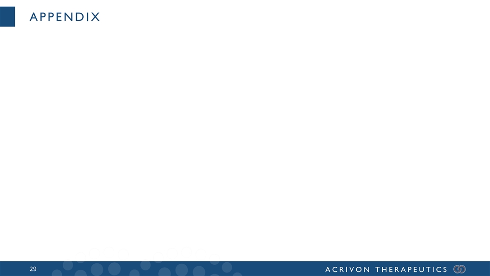 FINANCIAL HIGHLIGHTS Cash and marketable securities Projected runway at least into Fully Diluted Shares Outstanding $169.6M 27.0M Q4’24 Balance sheet Current operating plan with no Shares and equity grants 31-December-2022 additional financing outstanding 31-December-2022 Unaudited. 28 ACRIVON THERAPEUTICS