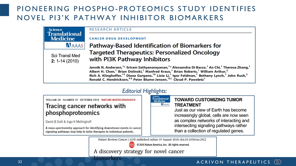 PIONEERING PHOSPHO -PROTEOMICS STUDY IDENTIFIES NOVEL PI3’K PATHWAY INHIBITOR BIOMARKERS Sci Transl Med 2: 1-14 (2010) Editorial Highlights: TOWARD CUSTOMIZING TUMOR TREATMENT Just as our view of Earth has become increasingly global, cells are now seen as complex networks of interacting and intersecting signaling pathways rather than a collection of regulated genes. A discovery strategy for novel cancer biomarkers 32 ACRIVON THERAPEUTICS