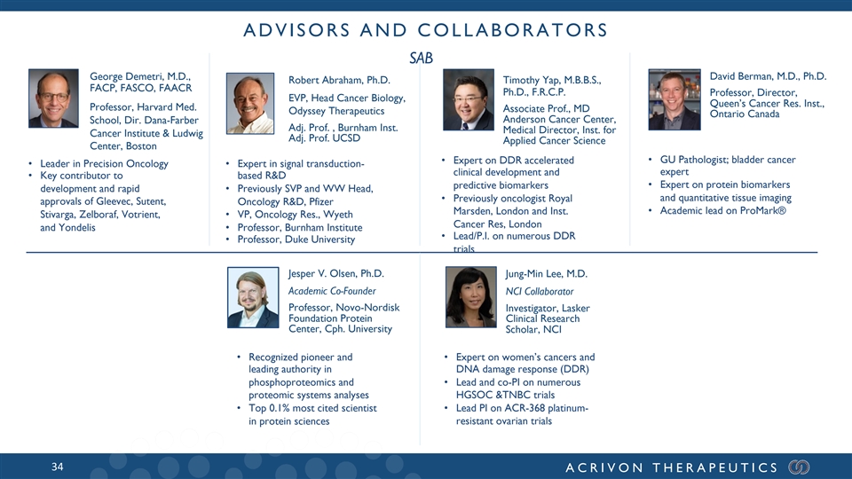 ADVISORS AND COLLABORATORS SAB David Berman, M.D., Ph.D. George Demetri, M.D., Robert Abraham, Ph.D. Timothy Yap, M.B.B.S., FACP, FASCO, FAACR Ph.D., F.R.C.P. Professor, Director, EVP, Head Cancer Biology, Queen’s Cancer Res. Inst., Professor, Harvard Med. Associate Prof., MD Odyssey Therapeutics Ontario Canada Anderson Cancer Center, School, Dir. Dana-Farber Adj. Prof. , Burnham Inst. Medical Director, Inst. for Cancer Institute & Ludwig Adj. Prof. UCSD Applied Cancer Science Center, Boston • GU Pathologist; bladder cancer • Expert on DDR accelerated • Leader in Precision Oncology • Expert in signal transduction- expert clinical development and • Key contributor to based R&D • Expert on protein biomarkers predictive biomarkers development and rapid • Previously SVP and WW Head, and quantitative tissue imaging • Previously oncologist Royal approvals of Gleevec, Sutent, Oncology R&D, Pfizer Marsden, London and Inst. • Academic lead on ProMark® Stivarga, Zelboraf, Votrient, • VP, Oncology Res., Wyeth Cancer Res, London and Yondelis • Professor, Burnham Institute • Lead/P.I. on numerous DDR • Professor, Duke University trials Jesper V. Olsen, Ph.D. Jung-Min Lee, M.D. Academic Co-Founder NCI Collaborator Professor, Novo-Nordisk Investigator, Lasker Foundation Protein Clinical Research Center, Cph. University Scholar, NCI • Recognized pioneer and • Expert on women’s cancers and leading authority in DNA damage response (DDR) phosphoproteomics and • Lead and co-PI on numerous proteomic systems analyses HGSOC &TNBC trials • Top 0.1% most cited scientist • Lead PI on ACR-368 platinum- in protein sciences resistant ovarian trials 34 ACRIVON THERAPEUTICS