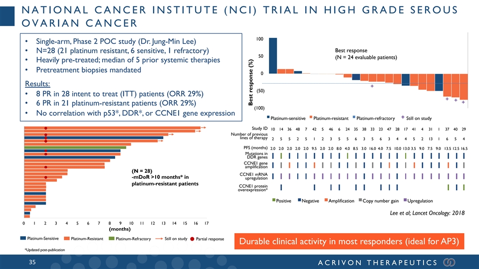 NATIONAL CANCER INSTITUTE (NCI) TRIAL IN HIGH GRADE SEROUS OVARIAN CANCER 100 • Single-arm, Phase 2 POC study (Dr. Jung-Min Lee) Best response • N=28 (21 platinum resistant, 6 sensitive, 1 refractory) 50 (N = 24 evaluable patients) • Heavily pre-treated; median of 5 prior systemic therapies • Pretreatment biopsies mandated 0 Results: (50) • 8 PR in 28 intent to treat (ITT) patients (ORR 29%) • 6 PR in 21 platinum-resistant patients (ORR 29%) (100) • No correlation with p53*, DDR*, or CCNE1 gene expression Platinum-sensitive Platinum-resistant Platinum-refractory Still on study Study ID 10 14 36 48 7 42 5 46 6 24 35 38 33 23 47 28 17 41 4 31 1 37 40 29 Number of previous lines of therapy 2 5 5 2 5 1 2 3 5 5 6 3 5 6 3 4 4 5 2 13 1 6 5 4 PFS (months) 2.0 2.0 2.0 2.0 2.0 9.5 2.0 2.0 8.0 4.0 8.5 3.0 16.0 4.0 7.5 10.0 13.0 3.5 9.0 7.5 9.0 13.5 12.5 16.5 Mutations in DDR genes CCNE1 gene amplification (N = 28) (N = 28) CCNE1 mRNA -mDoR >10 months* in upregulation -mDoR >10 months* in platinum-resistant patients CCNE1 protein overexpression* Positive Negative Amplification Copy number gain Upregulation Lee et al; Lancet Oncology: 2018 0 1 2 3 4 5 6 7 8 9 10 11 12 13 14 15 16 17 (months) Platinum-Sensitive Platinum-Resistant Platinum-Refractory Still on study Partial response Durable clinical activity in most responders (ideal for AP3) *Updated post-publication 35 ACRIVON THERAPEUTICS Best response (%)