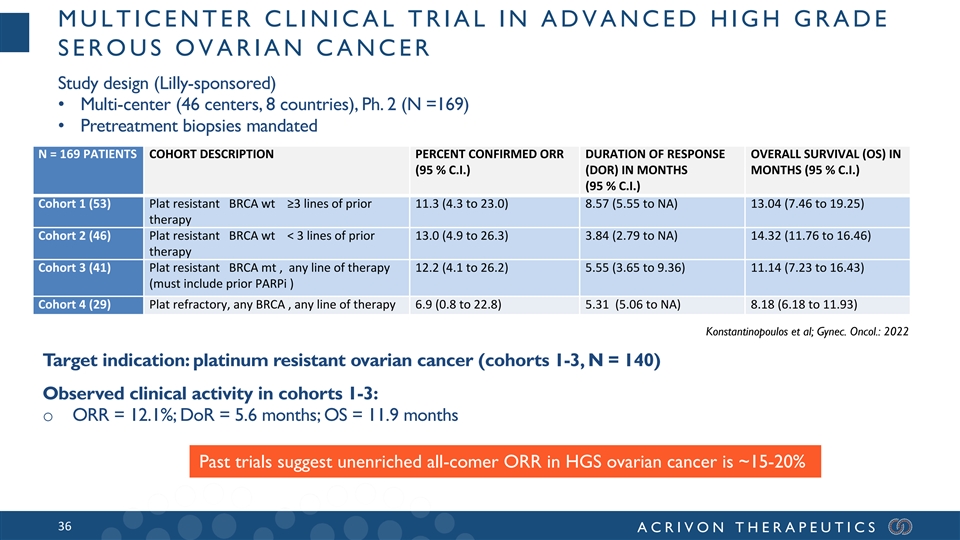 MULTICENTER CLINICAL TRIAL IN ADVANCED HIGH GRADE SEROUS OVARIAN CANCER Study design (Lilly-sponsored) • Multi-center (46 centers, 8 countries), Ph. 2 (N =169) • Pretreatment biopsies mandated N = 169 PATIENTS COHORT DESCRIPTION PERCENT CONFIRMED ORR DURATION OF RESPONSE OVERALL SURVIVAL (OS) IN (95 % C.I.) (DOR) IN MONTHS MONTHS (95 % C.I.) (95 % C.I.) Cohort 1 (53) Plat resistant BRCA wt ≥3 lines of prior 11.3 (4.3 to 23.0) 8.57 (5.55 to NA) 13.04 (7.46 to 19.25) therapy Cohort 2 (46) Plat resistant BRCA wt < 3 lines of prior 13.0 (4.9 to 26.3) 3.84 (2.79 to NA) 14.32 (11.76 to 16.46) therapy Cohort 3 (41) Plat resistant BRCA mt , any line of therapy 12.2 (4.1 to 26.2) 5.55 (3.65 to 9.36) 11.14 (7.23 to 16.43) (must include prior PARPi ) Cohort 4 (29) Plat refractory, any BRCA , any line of therapy 6.9 (0.8 to 22.8) 5.31 (5.06 to NA) 8.18 (6.18 to 11.93) Konstantinopoulos et al; Gynec. Oncol.: 2022 Target indication: platinum resistant ovarian cancer (cohorts 1-3, N = 140) Observed clinical activity in cohorts 1-3: o ORR = 12.1%; DoR = 5.6 months; OS = 11.9 months Past trials suggest unenriched all-comer ORR in HGS ovarian cancer is ~15-20% 36 ACRIVON THERAPEUTICS