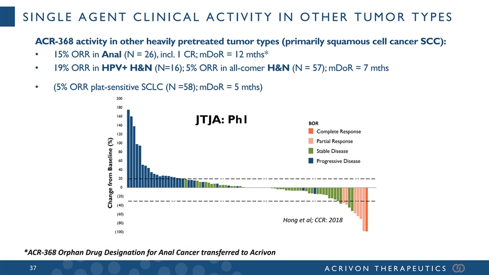 SINGLE AGENT CLINICAL ACTIVITY IN OTHER TUMOR TYPES ACR-368 activity in other heavily pretreated tumor types (primarily squamous cell cancer SCC): • 15% ORR in Anal (N = 26), incl. 1 CR; mDoR = 12 mths* • 19% ORR in HPV+ H&N (N=16); 5% ORR in all-comer H&N (N = 57); mDoR = 7 mths • (5% ORR plat-sensitive SCLC (N =58); mDoR = 5 mths) 200 180 160 JTJA: Ph1 BOR 140 Complete Response 120 Partial Response 100 Stable Disease 80 60 Progressive Disease 40 20 0 (20) (40) (60) Hong et al; CCR: 2018 (80) (100) *ACR-368 Orphan Drug Designation for Anal Cancer transferred to Acrivon 37 ACRIVON THERAPEUTICS Change from Baseline (%)