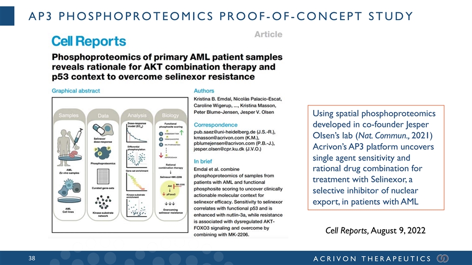 AP3 PHOSPHOPROTEOMICS PROOF -OF -CONCEPT STUDY Using spatial phosphoproteomics developed in co-founder Jesper Olsen’s lab (Nat. Commun., 2021) Acrivon’s AP3 platform uncovers single agent sensitivity and rational drug combination for treatment with Selinexor, a selective inhibitor of nuclear export, in patients with AML Cell Reports, August 9, 2022 38 ACRIVON THERAPEUTICS