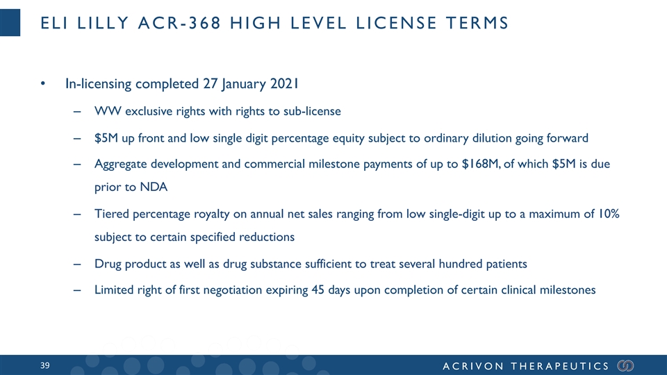 ELI LILLY ACR -368 HIGH LEVEL LICENSE TERMS • In-licensing completed 27 January 2021 – WW exclusive rights with rights to sub-license – $5M up front and low single digit percentage equity subject to ordinary dilution going forward – Aggregate development and commercial milestone payments of up to $168M, of which $5M is due prior to NDA – Tiered percentage royalty on annual net sales ranging from low single-digit up to a maximum of 10% subject to certain specified reductions – Drug product as well as drug substance sufficient to treat several hundred patients – Limited right of first negotiation expiring 45 days upon completion of certain clinical milestones 39 ACRIVON THERAPEUTICS