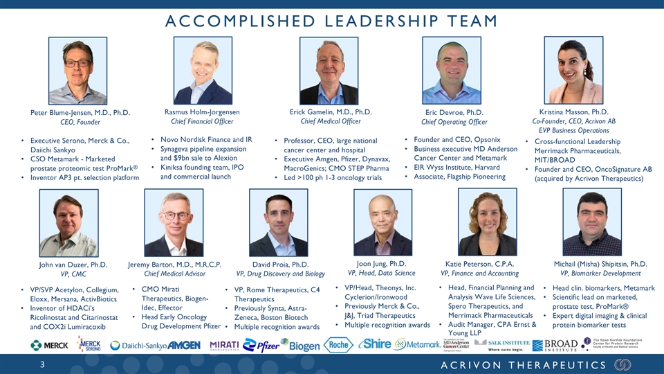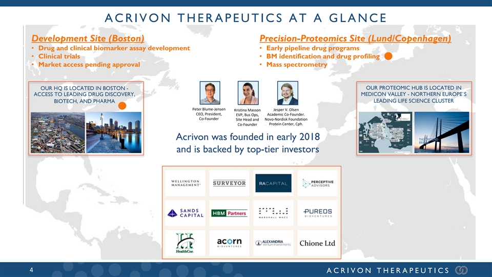 ACCOMPLISHED LEADERSHIP TEAM Rasmus Holm-Jorgensen Erick Gamelin, M.D., Ph.D. Kristina Masson, Ph.D. Peter Blume-Jensen, M.D., Ph.D. Eric Devroe, Ph.D. Chief Financial Officer Chief Medical Officer Co-Founder, CEO, Acrivon AB CEO, Founder Chief Operating Officer EVP Business Operations • Novo Nordisk Finance and IR • Founder and CEO, Opsonix • Executive Serono, Merck & Co., • Professor, CEO, large national • Cross-functional Leadership • Synageva pipeline expansion • Business executive MD Anderson Daiichi Sankyo cancer center and hospital Merrimack Pharmaceuticals, and $9bn sale to Alexion Cancer Center and Metamark • CSO Metamark - Marketed • Executive Amgen, Pfizer, Dynavax, MIT/BROAD ® • Kiniksa founding team, IPO • EIR Wyss Institute, Harvard prostate proteomic test ProMark MacroGenics; CMO STEP Pharma • Founder and CEO, OncoSignature AB and commercial launch • Associate, Flagship Pioneering • Inventor AP3 pt. selection platform • Led >100 ph 1-3 oncology trials (acquired by Acrivon Therapeutics) Joon Jung, Ph.D. John van Duzer, Ph.D. Jeremy Barton, M.D., M.R.C.P. David Proia, Ph.D. Katie Peterson, C.P.A. Michail (Misha) Shipitsin, Ph.D. VP, Head, Data Science Chief Medical Advisor VP, Drug Discovery and Biology VP, Finance and Accounting VP, Biomarker Development VP, CMC • VP/Head, Theonys, Inc. • Head, Financial Planning and • Head clin. biomarkers, Metamark • CMO Mirati • VP/SVP Acetylon, Collegium, • VP, Rome Therapeutics, C4 Analysis Wave Life Sciences, • Scientific lead on marketed, Cyclerion/Ironwood Therapeutics, Biogen- Eloxx, Mersana, ActivBiotics Therapeutics • Previously Merck & Co., Spero Therapeutics, and prostate test, ProMark® • Inventor of HDACi’s Idec, Effector • Previously Synta, Astra- J&J, Triad Therapeutics Merrimack Pharmaceuticals • Expert digital imaging & clinical • Head Early Oncology Ricolinostat and Citarinostat Zeneca, Boston Biotech • Audit Manager, CPA Ernst & • Multiple recognition awards protein biomarker tests Drug Development Pfizer and COX2i Lumiracoxib • Multiple recognition awards Young LLP 3 ACRIVON THERAPEUTICS