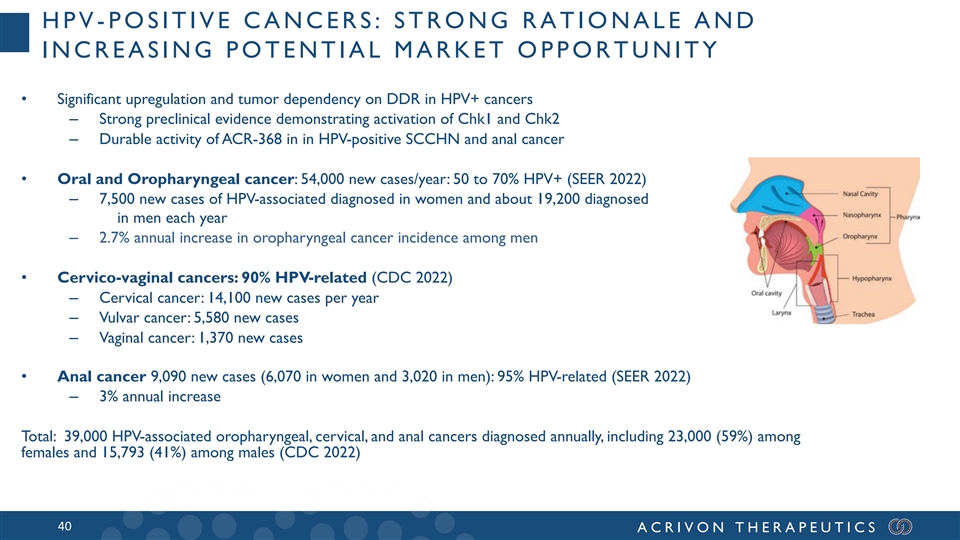 HPV -POSITIVE CANCERS: STRONG RATIONALE AND INCREASING POTENTIAL MARKET OPPORTUNITY • Significant upregulation and tumor dependency on DDR in HPV+ cancers – Strong preclinical evidence demonstrating activation of Chk1 and Chk2 – Durable activity of ACR-368 in in HPV-positive SCCHN and anal cancer • Oral and Oropharyngeal cancer: 54,000 new cases/year: 50 to 70% HPV+ (SEER 2022) – 7,500 new cases of HPV-associated diagnosed in women and about 19,200 diagnosed in men each year – 2.7% annual increase in oropharyngeal cancer incidence among men • Cervico-vaginal cancers: 90% HPV-related (CDC 2022) – Cervical cancer: 14,100 new cases per year – Vulvar cancer: 5,580 new cases – Vaginal cancer: 1,370 new cases • Anal cancer 9,090 new cases (6,070 in women and 3,020 in men): 95% HPV-related (SEER 2022) – 3% annual increase Total: 39,000 HPV-associated oropharyngeal, cervical, and anal cancers diagnosed annually, including 23,000 (59%) among females and 15,793 (41%) among males (CDC 2022) 40 ACRIVON THERAPEUTICS