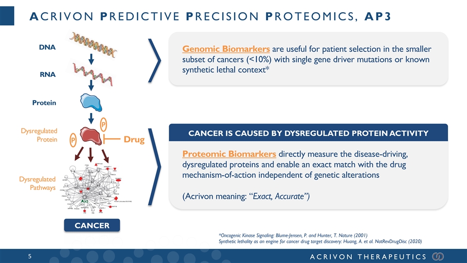 ACRIVON THERAPEUTICS AT A GLANCE Development Site (Boston) Precision-Proteomics Site (Lund/Copenhagen) • Drug and clinical biomarker assay development • Early pipeline drug programs • Clinical trials • BM identification and drug profiling • Market access pending approval • Mass spectrometry OUR PROTEOMIC HUB IS LOCATED IN OUR HQ IS LOCATED IN BOSTON - MEDICON VALLEY - NORTHERN EUROPE`S ACCESS TO LEADING DRUG DISCOVERY, LEADING LIFE SCIENCE CLUSTER BIOTECH, AND PHARMA Peter Blume-Jensen Kristina Masson Jesper V. Olsen CEO, President, Academic Co-Founder. EVP, Bus Ops, Co-Founder Novo-Nordisk Foundation Site Head and Protein Center, Cph. Co-Founder Acrivon was founded in early 2018 and is backed by top-tier investors 4 ACRIVON THERAPEUTICS