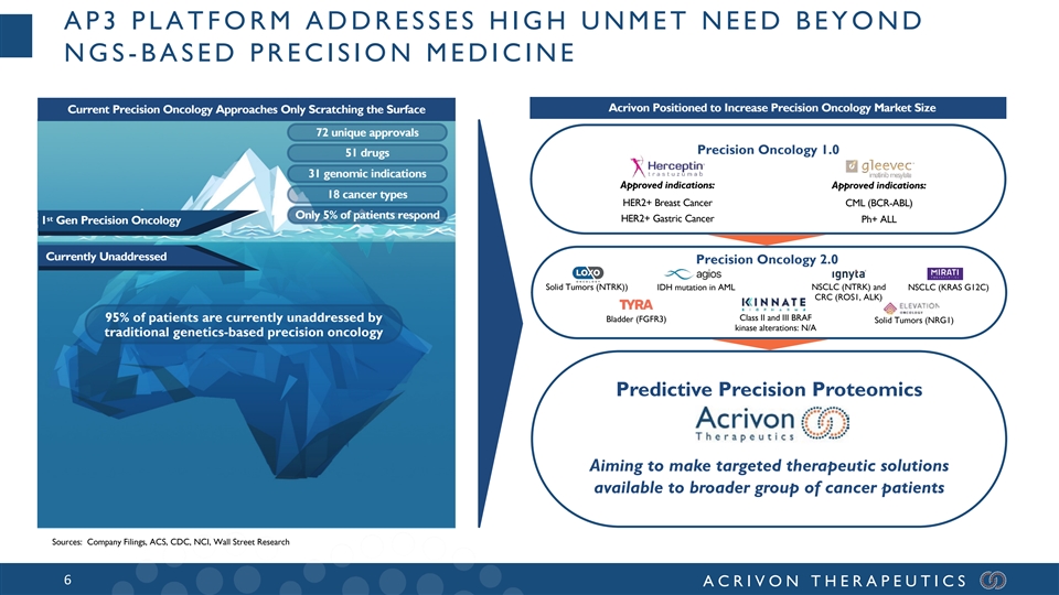 ACRIVON PREDICTIVE PRECISION PROTEOMICS, AP3 DNA Genomic Biomarkers are useful for patient selection in the smaller subset of cancers (<10%) with single gene driver mutations or known synthetic lethal context* RNA Protein P Dysregulated CANCER IS CAUSED BY DYSREGULATED PROTEIN ACTIVITY Protein Drug P Proteomic Biomarkers directly measure the disease-driving, dysregulated proteins and enable an exact match with the drug mechanism-of-action independent of genetic alterations Dysregulated Pathways (Acrivon meaning: “Exact, Accurate”) CANCER *Oncogenic Kinase Signaling: Blume-Jensen, P. and Hunter, T. Nature (2001) Synthetic lethality as an engine for cancer drug target discovery: Huang, A. et al. NatRevDrugDisc (2020) 5 ACRIVON THERAPEUTICS