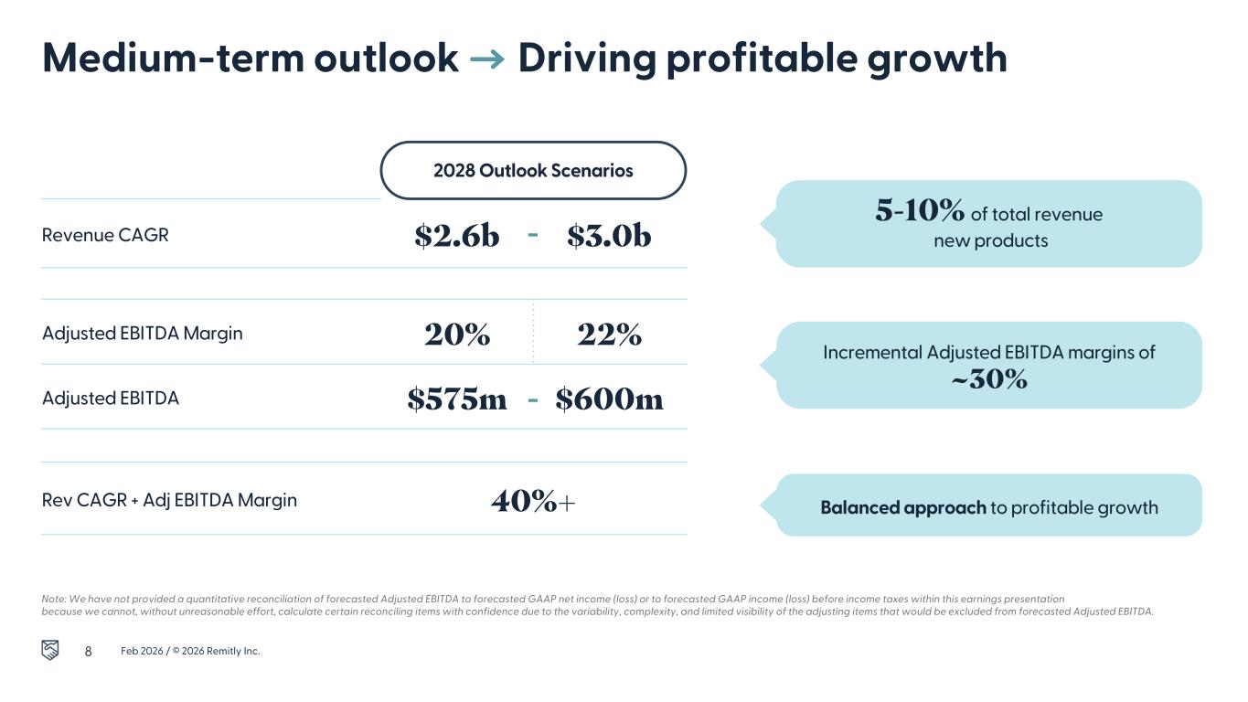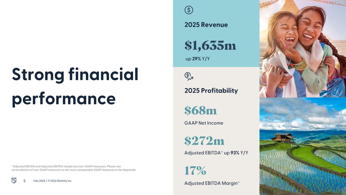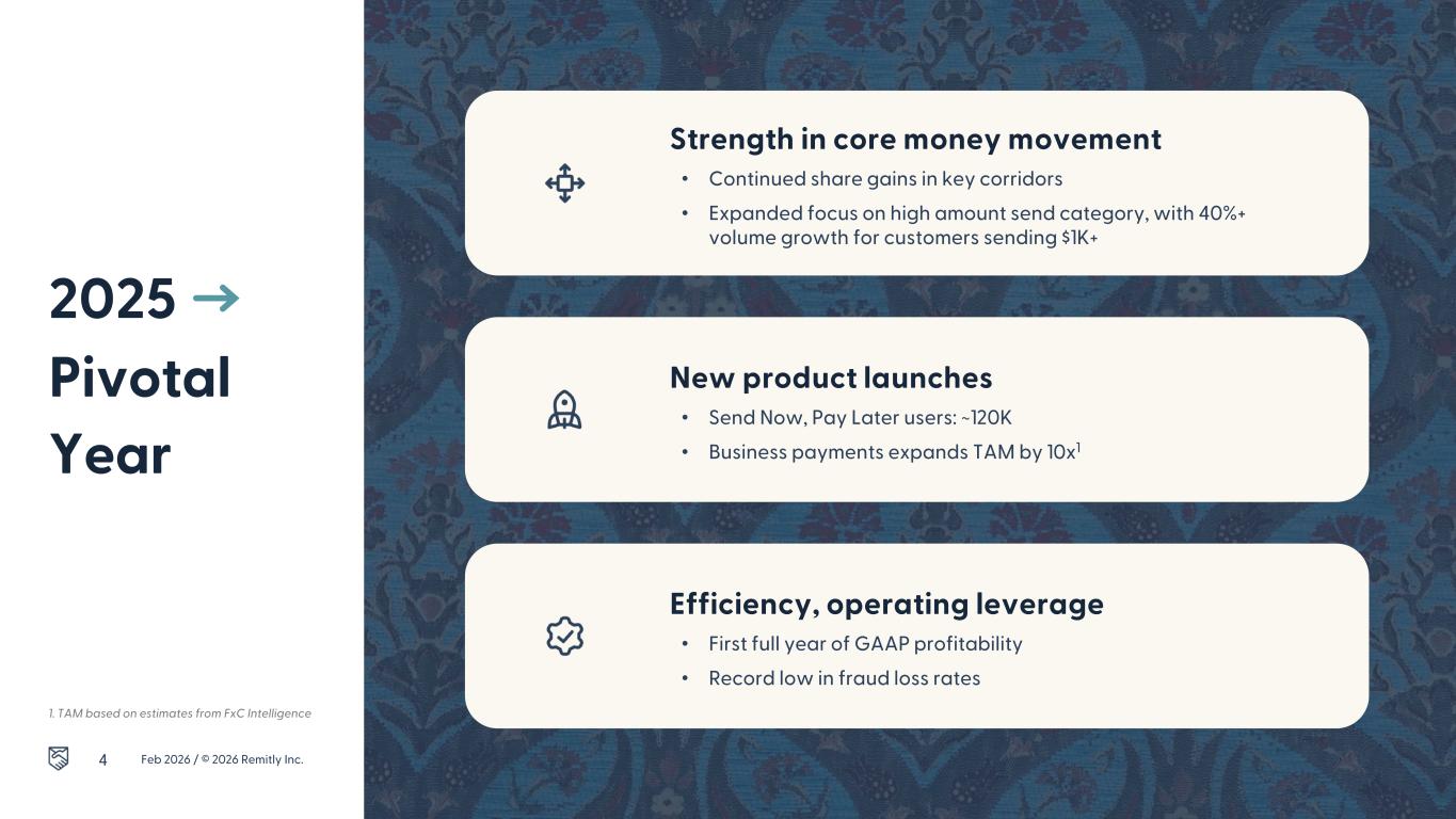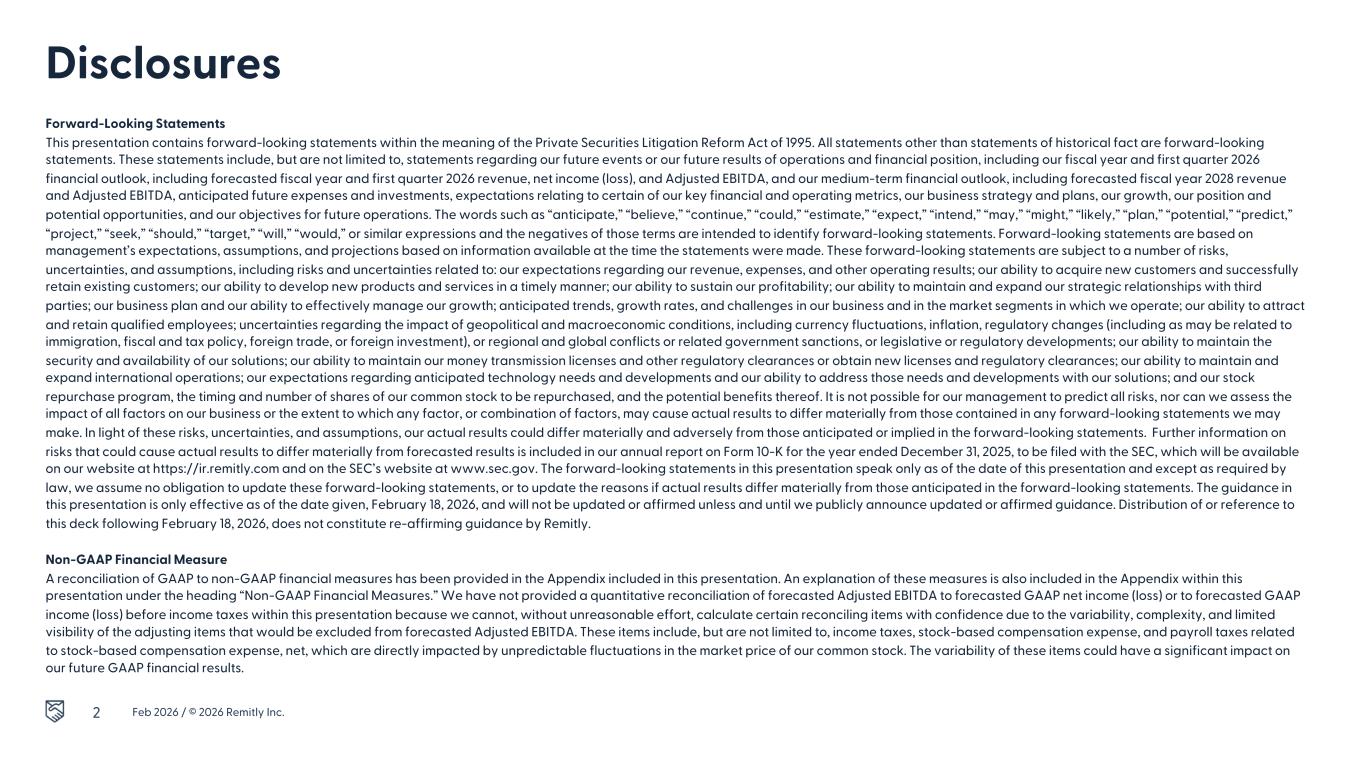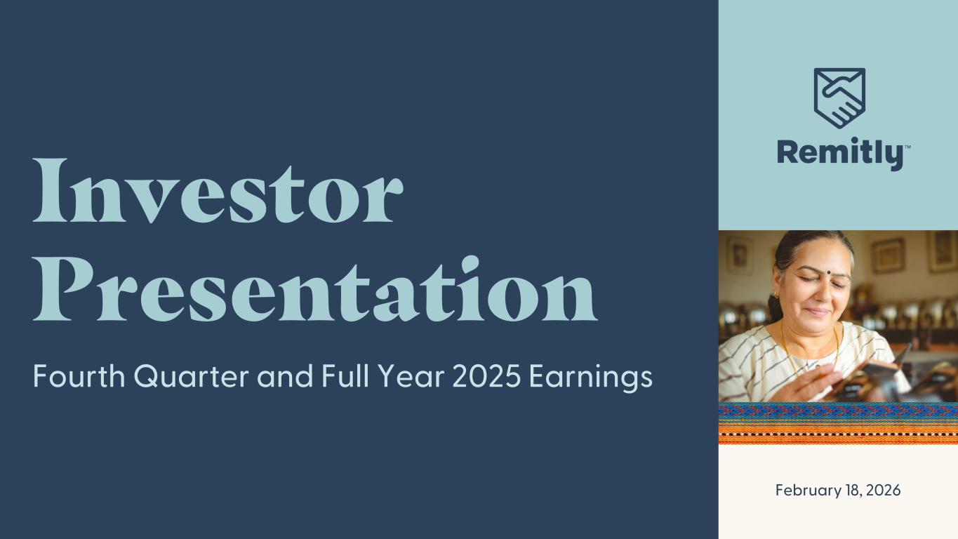 Feb 2026 / © 2026 Remitly Inc. Disclosures 2 Forward-Looking Statements This presentation contains forward-looking statements within the meaning of the Private Securities Litigation Reform Act of 1995. All statements other than statements of historical fact are forward-looking statements. These statements include, but are not limited to, statements regarding our future events or our future results of operations and financial position, including our fiscal year and first quarter 2026 financial outlook, including forecasted fiscal year and first quarter 2026 revenue, net income (loss), and Adjusted EBITDA, and our medium-term financial outlook, including forecasted fiscal year 2028 revenue and Adjusted EBITDA, anticipated future expenses and investments, expectations relating to certain of our key financial and operating metrics, our business strategy and plans, our growth, our position and potential opportunities, and our objectives for future operations. The words such as “anticipate,” “believe,” “continue,” “could,” “estimate,” “expect,” “intend,” “may,” “might,” “likely,” “plan,” “potential,” “predict,” “project,” “seek,” “should,” “target,” “will,” “would,” or similar expressions and the negatives of those terms are intended to identify forward-looking statements. Forward-looking statements are based on management’s expectations, assumptions, and projections based on information available at the time the statements were made. These forward-looking statements are subject to a number of risks, uncertainties, and assumptions, including risks and uncertainties related to: our expectations regarding our revenue, expenses, and other operating results; our ability to acquire new customers and successfully retain existing customers; our ability to develop new products and services in a timely manner; our ability to sustain our profitability; our ability to maintain and expand our strategic relationships with third parties; our business plan and our ability to effectively manage our growth; anticipated trends, growth rates, and challenges in our business and in the market segments in which we operate; our ability to attract and retain qualified employees; uncertainties regarding the impact of geopolitical and macroeconomic conditions, including currency fluctuations, inflation, regulatory changes (including as may be related to immigration, fiscal and tax policy, foreign trade, or foreign investment), or regional and global conflicts or related government sanctions, or legislative or regulatory developments; our ability to maintain the security and availability of our solutions; our ability to maintain our money transmission licenses and other regulatory clearances or obtain new licenses and regulatory clearances; our ability to maintain and expand international operations; our expectations regarding anticipated technology needs and developments and our ability to address those needs and developments with our solutions; and our stock repurchase program, the timing and number of shares of our common stock to be repurchased, and the potential benefits thereof. It is not possible for our management to predict all risks, nor can we assess the impact of all factors on our business or the extent to which any factor, or combination of factors, may cause actual results to differ materially from those contained in any forward-looking statements we may make. In light of these risks, uncertainties, and assumptions, our actual results could differ materially and adversely from those anticipated or implied in the forward-looking statements. Further information on risks that could cause actual results to differ materially from forecasted results is included in our annual report on Form 10-K for the year ended December 31, 2025, to be filed with the SEC, which will be available on our website at https://ir.remitly.com and on the SEC’s website at www.sec.gov. The forward-looking statements in this presentation speak only as of the date of this presentation and except as required by law, we assume no obligation to update these forward-looking statements, or to update the reasons if actual results differ materially from those anticipated in the forward-looking statements. The guidance in this presentation is only effective as of the date given, February 18, 2026, and will not be updated or affirmed unless and until we publicly announce updated or affirmed guidance. Distribution of or reference to this deck following February 18, 2026, does not constitute re-affirming guidance by Remitly. Non-GAAP Financial Measure A reconciliation of GAAP to non-GAAP financial measures has been provided in the Appendix included in this presentation. An explanation of these measures is also included in the Appendix within this presentation under the heading “Non-GAAP Financial Measures.” We have not provided a quantitative reconciliation of forecasted Adjusted EBITDA to forecasted GAAP net income (loss) or to forecasted GAAP income (loss) before income taxes within this presentation because we cannot, without unreasonable effort, calculate certain reconciling items with confidence due to the variability, complexity, and limited visibility of the adjusting items that would be excluded from forecasted Adjusted EBITDA. These items include, but are not limited to, income taxes, stock-based compensation expense, and payroll taxes related to stock-based compensation expense, net, which are directly impacted by unpredictable fluctuations in the market price of our common stock. The variability of these items could have a significant impact on our future GAAP financial results.