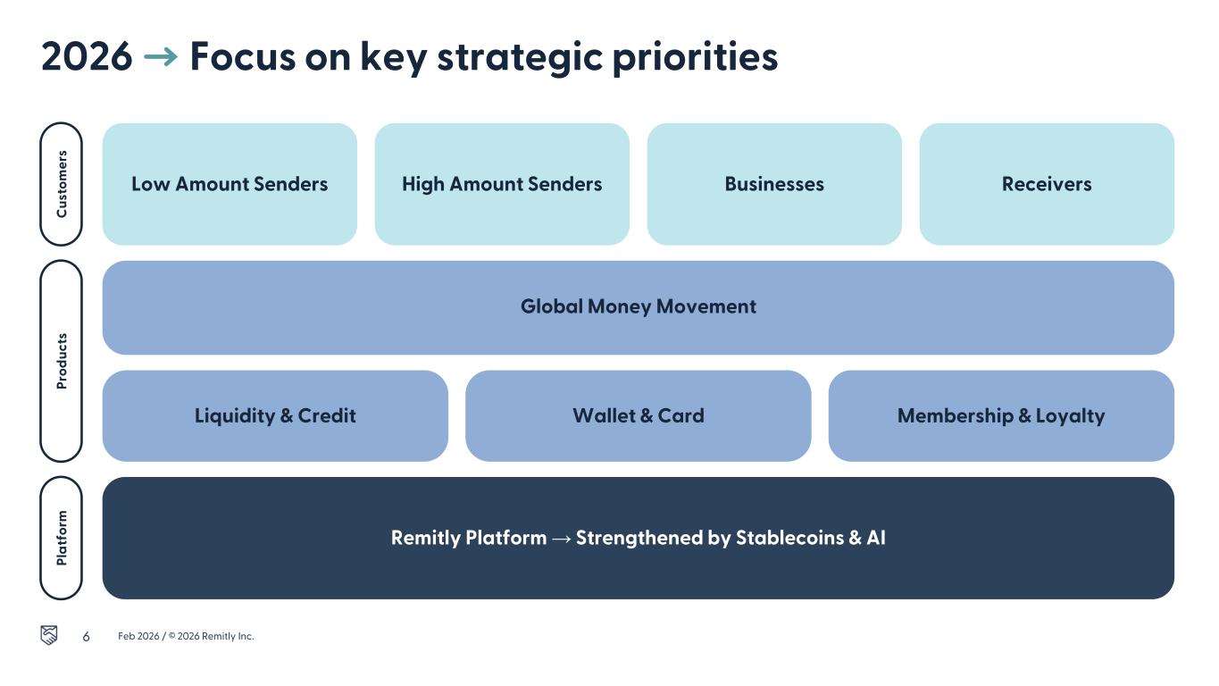 Feb 2026 / © 2026 Remitly Inc. 2026 → Focus on key strategic priorities 6 C us to m er s Pr od uc ts Pl a tf or m Remitly Platform → Strengthened by Stablecoins & AI Global Money Movement Wallet & CardLiquidity & Credit Membership & Loyalty BusinessesHigh Amount SendersLow Amount Senders Receivers