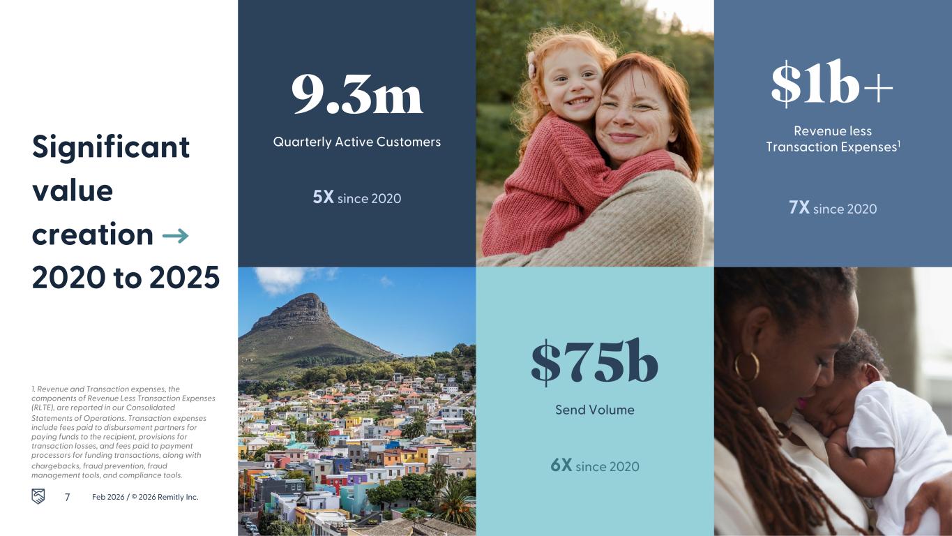 Feb 2026 / © 2026 Remitly Inc. Significant value creation → 2020 to 2025 1. Revenue and Transaction expenses, the components of Revenue Less Transaction Expenses (RLTE), are reported in our Consolidated Statements of Operations. Transaction expenses include fees paid to disbursement partners for paying funds to the recipient, provisions for transaction losses, and fees paid to payment processors for funding transactions, along with chargebacks, fraud prevention, fraud management tools, and compliance tools. 9.3m Quarterly Active Customers 5X since 2020 $75b Send Volume 6X since 2020 $1b+ Revenue less Transaction Expenses1 7X since 2020 7