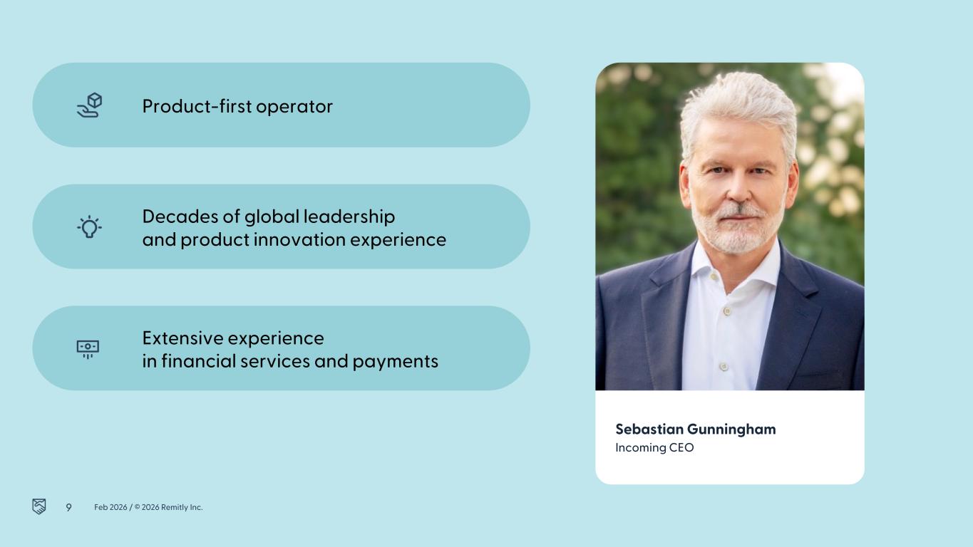Feb 2026 / © 2026 Remitly Inc. Medium-term outlook →Driving profitable growth 8 Revenue CAGR $2.6b $3.0b 2028 Outlook Scenarios Adjusted EBITDA Margin 20% 22% Adjusted EBITDA $575m $600m 5-10% of total revenue new products- Incremental Adjusted EBITDA margins of ~30% Balanced approach to profitable growthRev CAGR + Adj EBITDA Margin 40%+ - Note: We have not provided a quantitative reconciliation of forecasted Adjusted EBITDA to forecasted GAAP net income (loss) or to forecasted GAAP income (loss) before income taxes within this earnings presentation because we cannot, without unreasonable effort, calculate certain reconciling items with confidence due to the variability, complexity, and limited visibility of the adjusting items that would be excluded from forecasted Adjusted EBITDA.