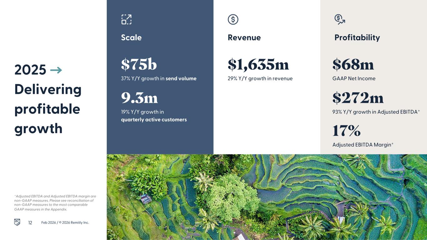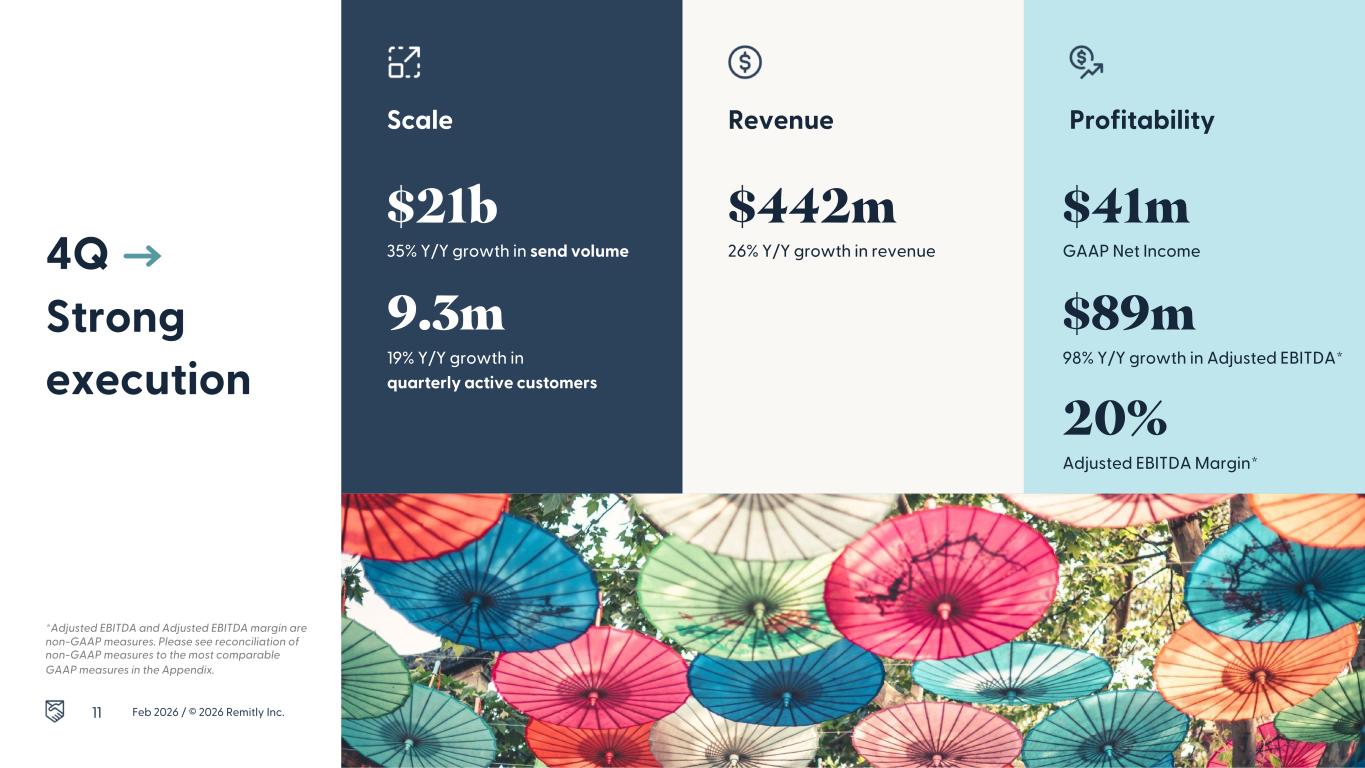 Feb 2026 / © 2026 Remitly Inc. Revenue ProfitabilityScale 4Q — Strong execution *Adjusted EBITDA and Adjusted EBITDA margin are non-GAAP measures. Please see reconciliation of non-GAAP measures to the most comparable GAAP measures in the Appendix. 9.3m 19% Y/Y growth in quarterly active customers $21b 35% Y/Y growth in send volume $442m 26% Y/Y growth in revenue $89m 98% Y/Y growth in Adjusted EBITDA* $41m GAAP Net Income 20% Adjusted EBITDA Margin* 11