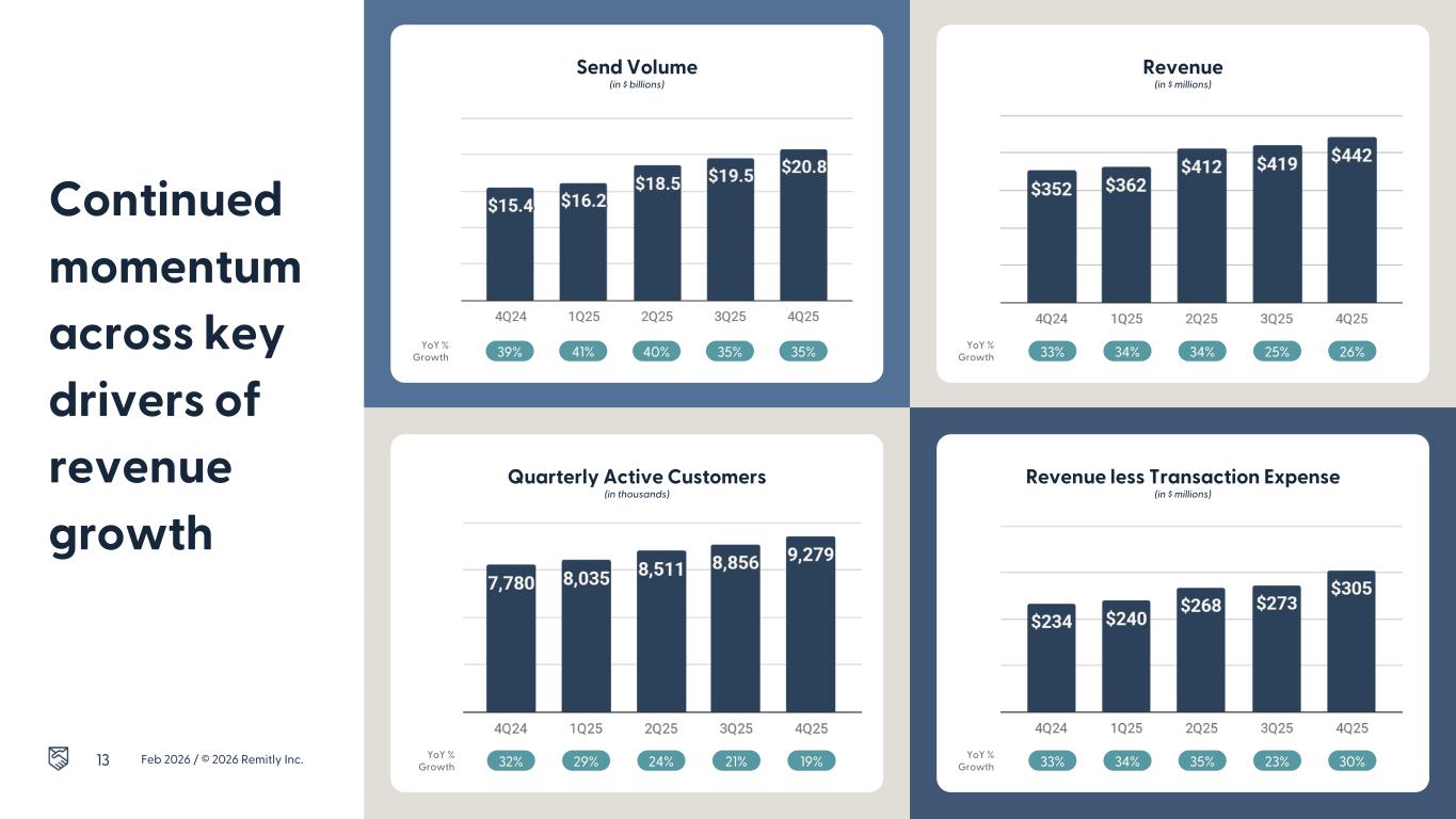 Feb 2026 / © 2026 Remitly Inc. Quarterly Active Customers (in thousands) Revenue less Transaction Expense (in $ millions) Revenue (in $ millions) Send Volume (in billions)Send Volume (in $ billions) Continued momentum across key drivers of revenue growth YoY % Growth 33% 34% 34% 25% 26%YoY % Growth 39% 41% 40% 35% 35% YoY % Growth 32% 29% 24% 21% 19% YoY % Growth 33% 34% 35% 23% 30%13