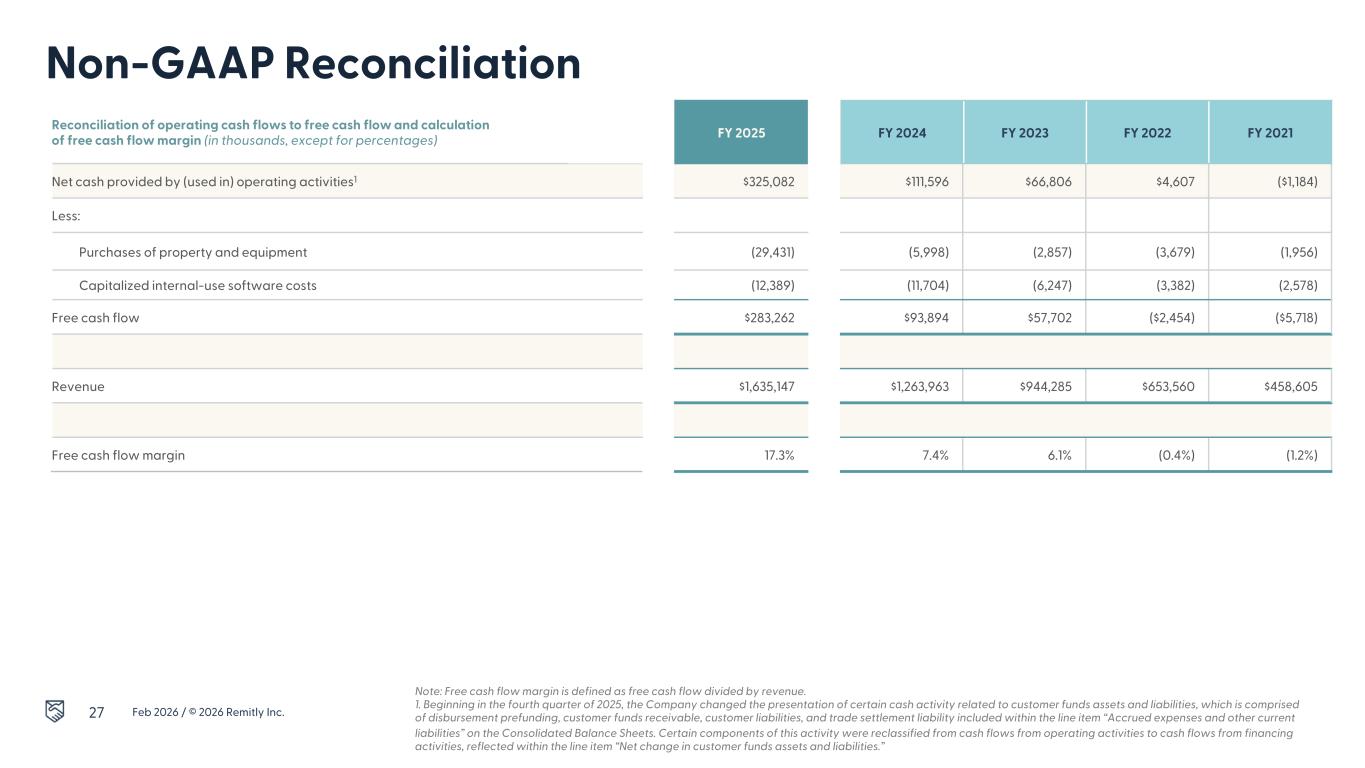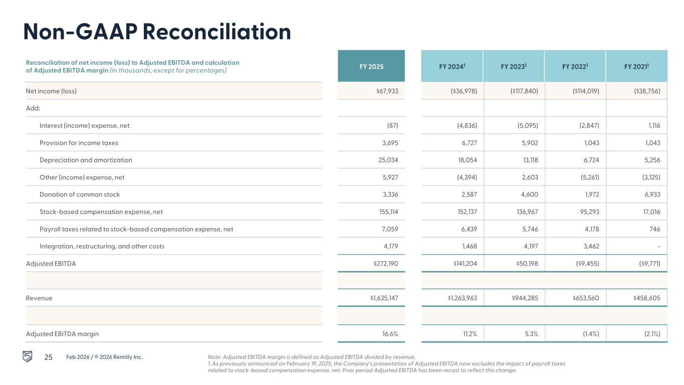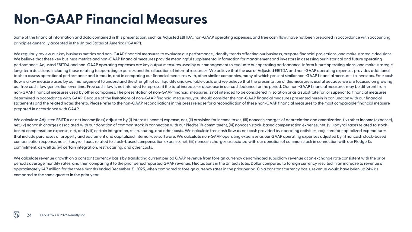 Feb 2026 / © 2026 Remitly Inc. Non-GAAP Financial Measures 24 Some of the financial information and data contained in this presentation, such as Adjusted EBITDA, non-GAAP operating expenses, and free cash flow, have not been prepared in accordance with accounting principles generally accepted in the United States of America ("GAAP"). We regularly review our key business metrics and non-GAAP financial measures to evaluate our performance, identify trends affecting our business, prepare financial projections, and make strategic decisions. We believe that these key business metrics and non-GAAP financial measures provide meaningful supplemental information for management and investors in assessing our historical and future operating performance. Adjusted EBITDA and non-GAAP operating expenses are key output measures used by our management to evaluate our operating performance, inform future operating plans, and make strategic long-term decisions, including those relating to operating expenses and the allocation of internal resources. We believe that the use of Adjusted EBITDA and non-GAAP operating expenses provides additional tools to assess operational performance and trends in, and in comparing our financial measures with, other similar companies, many of which present similar non-GAAP financial measures to investors. Free cash flow is a key measure used by our management to understand the strength of our liquidity and available cash, and we believe that the presentation of this measure is useful because we are focused on growing our free cash flow generation over time. Free cash flow is not intended to represent the total increase or decrease in our cash balance for the period. Our non-GAAP financial measures may be different from non-GAAP financial measures used by other companies. The presentation of non-GAAP financial measures is not intended to be considered in isolation or as a substitute for, or superior to, financial measures determined in accordance with GAAP. Because of the limitations of non-GAAP financial measures, you should consider the non-GAAP financial measures presented herein in conjunction with our financial statements and the related notes thereto. Please refer to the non-GAAP reconciliations in this press release for a reconciliation of these non-GAAP financial measures to the most comparable financial measure prepared in accordance with GAAP. We calculate Adjusted EBITDA as net income (loss) adjusted by (i) interest (income) expense, net, (ii) provision for income taxes, (iii) noncash charges of depreciation and amortization, (iv) other income (expense), net, (v) noncash charges associated with our donation of common stock in connection with our Pledge 1% commitment, (vi) noncash stock-based compensation expense, net, (vii) payroll taxes related to stock- based compensation expense, net, and (viii) certain integration, restructuring, and other costs. We calculate free cash flow as net cash provided by operating activities, adjusted for capitalized expenditures that include purchases of property and equipment and capitalized internal-use software. We calculate non-GAAP operating expenses as our GAAP operating expenses adjusted by (i) noncash stock-based compensation expense, net; (ii) payroll taxes related to stock-based compensation expense, net; (iii) noncash charges associated with our donation of common stock in connection with our Pledge 1% commitment; as well as (iv) certain integration, restructuring, and other costs. We calculate revenue growth on a constant currency basis by translating current period GAAP revenue from foreign currency denominated subsidiary revenue at an exchange rate consistent with the prior period's average monthly rates, and then comparing it to the prior period reported GAAP revenue. Fluctuations in the United States Dollar compared to foreign currency resulted in an increase to revenue of approximately $4.7 million for the three months ended December 31, 2025, when compared to foreign currency rates in the prior period. On a constant currency basis, revenue would have been up 24% as compared to the same quarter in the prior year.