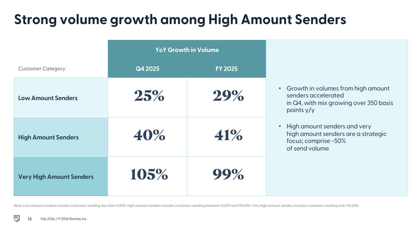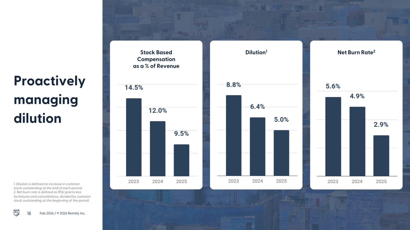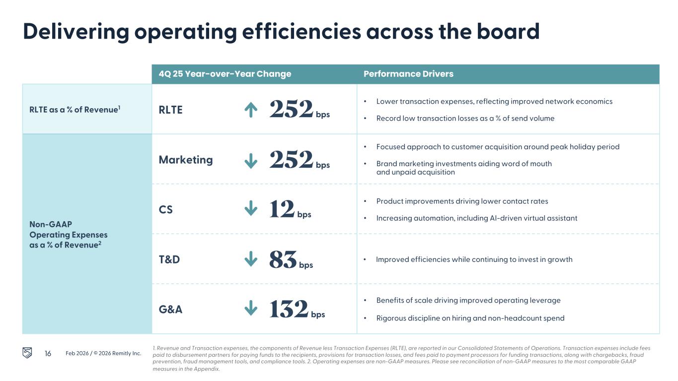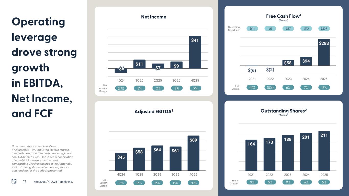 Feb 2026 / © 2026 Remitly Inc. Non-GAAP Financial Measures 24 Some of the financial information and data contained in this presentation, such as Adjusted EBITDA, non-GAAP operating expenses, and free cash flow, have not been prepared in accordance with accounting principles generally accepted in the United States of America ("GAAP"). We regularly review our key business metrics and non-GAAP financial measures to evaluate our performance, identify trends affecting our business, prepare financial projections, and make strategic decisions. We believe that these key business metrics and non-GAAP financial measures provide meaningful supplemental information for management and investors in assessing our historical and future operating performance. Adjusted EBITDA and non-GAAP operating expenses are key output measures used by our management to evaluate our operating performance, inform future operating plans, and make strategic long-term decisions, including those relating to operating expenses and the allocation of internal resources. We believe that the use of Adjusted EBITDA and non-GAAP operating expenses provides additional tools to assess operational performance and trends in, and in comparing our financial measures with, other similar companies, many of which present similar non-GAAP financial measures to investors. Free cash flow is a key measure used by our management to understand the strength of our liquidity and available cash, and we believe that the presentation of this measure is useful because we are focused on growing our free cash flow generation over time. Free cash flow is not intended to represent the total increase or decrease in our cash balance for the period. Our non-GAAP financial measures may be different from non-GAAP financial measures used by other companies. The presentation of non-GAAP financial measures is not intended to be considered in isolation or as a substitute for, or superior to, financial measures determined in accordance with GAAP. Because of the limitations of non-GAAP financial measures, you should consider the non-GAAP financial measures presented herein in conjunction with our financial statements and the related notes thereto. Please refer to the non-GAAP reconciliations in this press release for a reconciliation of these non-GAAP financial measures to the most comparable financial measure prepared in accordance with GAAP. We calculate Adjusted EBITDA as net income (loss) adjusted by (i) interest (income) expense, net, (ii) provision for income taxes, (iii) noncash charges of depreciation and amortization, (iv) other income (expense), net, (v) noncash charges associated with our donation of common stock in connection with our Pledge 1% commitment, (vi) noncash stock-based compensation expense, net, (vii) payroll taxes related to stock- based compensation expense, net, and (viii) certain integration, restructuring, and other costs. We calculate free cash flow as net cash provided by operating activities, adjusted for capitalized expenditures that include purchases of property and equipment and capitalized internal-use software. We calculate non-GAAP operating expenses as our GAAP operating expenses adjusted by (i) noncash stock-based compensation expense, net; (ii) payroll taxes related to stock-based compensation expense, net; (iii) noncash charges associated with our donation of common stock in connection with our Pledge 1% commitment; as well as (iv) certain integration, restructuring, and other costs. We calculate revenue growth on a constant currency basis by translating current period GAAP revenue from foreign currency denominated subsidiary revenue at an exchange rate consistent with the prior period's average monthly rates, and then comparing it to the prior period reported GAAP revenue. Fluctuations in the United States Dollar compared to foreign currency resulted in an increase to revenue of approximately $4.7 million for the three months ended December 31, 2025, when compared to foreign currency rates in the prior period. On a constant currency basis, revenue would have been up 24% as compared to the same quarter in the prior year.