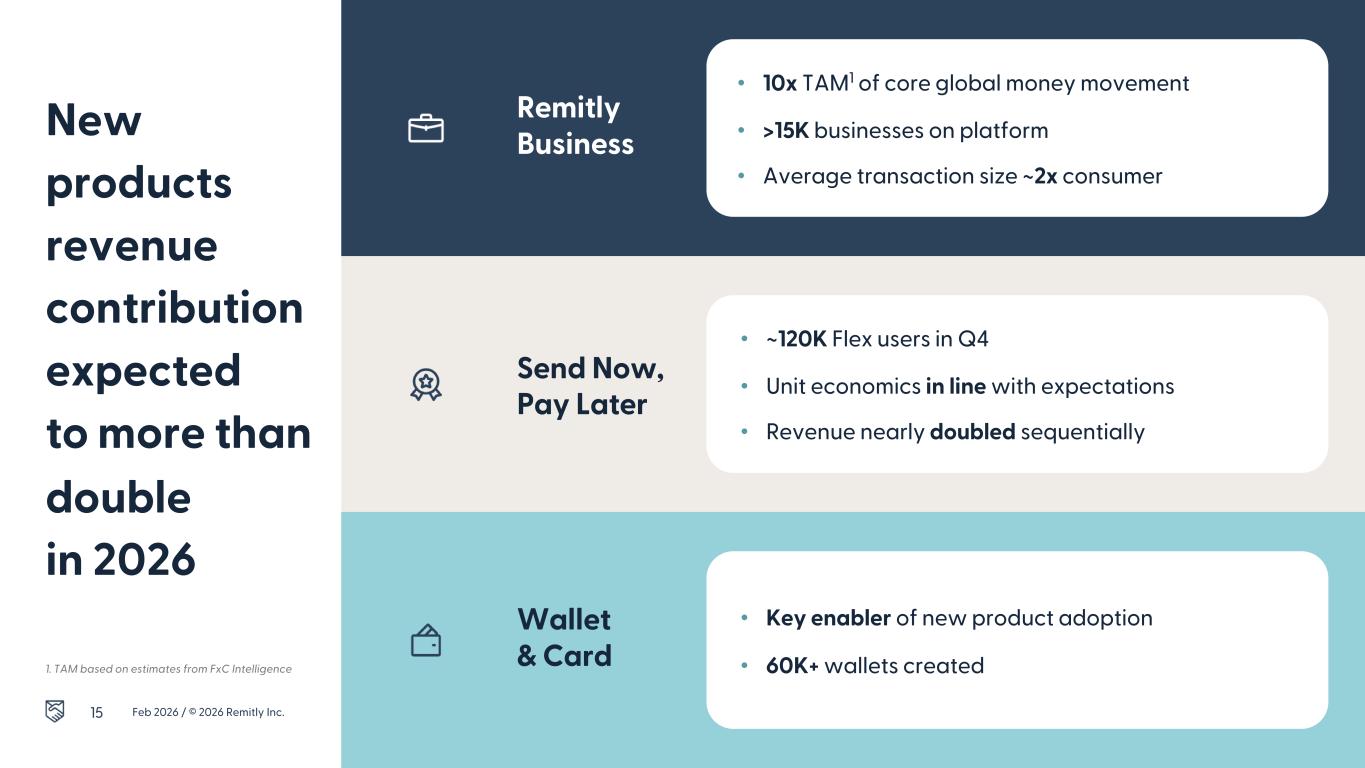 Feb 2026 / © 2026 Remitly Inc. Remitly Business Send Now, Pay Later Wallet & Card • 10x TAM1 of core global money movement • >15K businesses on platform • Average transaction size ~2x consumer • ~120K Flex users in Q4 • Unit economics in line with expectations • Revenue nearly doubled sequentially • Key enabler of new product adoption • 60K+ wallets created 1. TAM based on estimates from FxC Intelligence New products revenue contribution expected to more than double in 2026 15