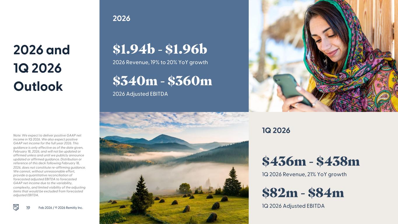 Feb 2026 / © 2026 Remitly Inc. Note: We expect to deliver positive GAAP net income in 1Q 2026. We also expect positive GAAP net income for the full year 2026. This guidance is only effective as of the date given, February 18, 2026, and will not be updated or affirmed unless and until we publicly announce updated or affirmed guidance. Distribution or reference of this deck following February 18, 2026, does not constitute re-affirming guidance. We cannot, without unreasonable effort, provide a quantitative reconciliation of forecasted adjusted EBITDA to forecasted GAAP net income due to the variability, complexity, and limited visibility of the adjusting items that would be excluded from forecasted adjusted EBITDA. 2026 and 1Q 2026 Outlook 2026 $1.94b - $1.96b 2026 Revenue, 19% to 20% YoY growth $340m - $360m 2026 Adjusted EBITDA 1Q 2026 $436m - $438m 1Q 2026 Revenue, 21% YoY growth $82m - $84m 1Q 2026 Adjusted EBITDA19