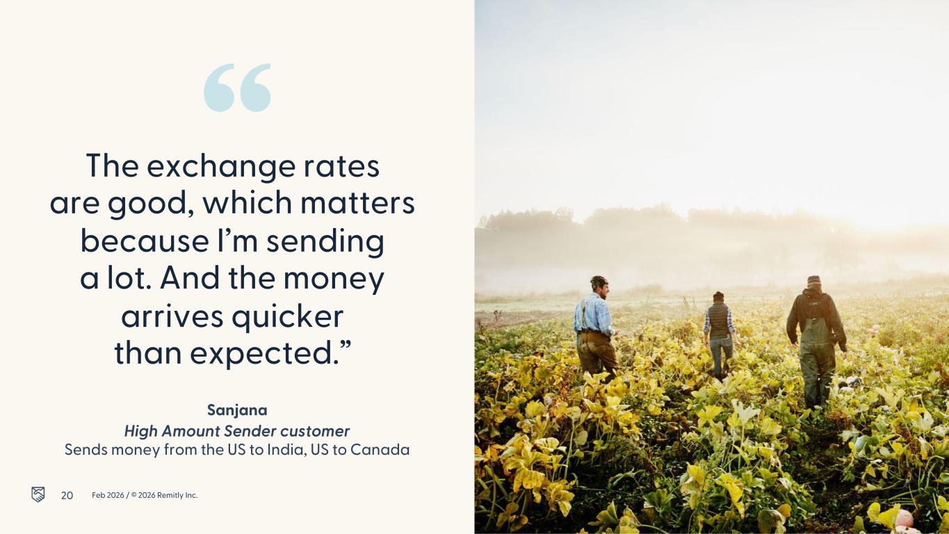 Feb 2026 / © 2026 Remitly Inc. The exchange rates are good, which matters because I’m sending a lot. And the money arrives quicker than expected.” Sanjana High Amount Sender customer Sends money from the US to India, US to Canada “ 20