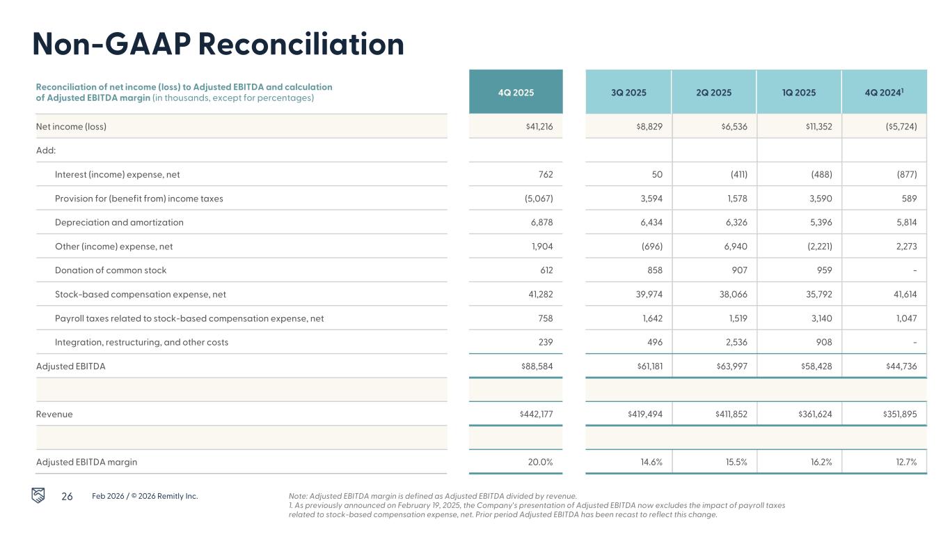 Feb 2026 / © 2026 Remitly Inc. Reconciliation of net income (loss) to Adjusted EBITDA and calculation of Adjusted EBITDA margin (in thousands, except for percentages) FY 2025 FY 20241 FY 20231 FY 20221 FY 20211 Non-GAAP Reconciliation 25 Net income (loss) $67,933 ($36,978) ($117,840) ($114,019) ($38,756) Add: Interest (income) expense, net (87) (4,836) (5,095) (2,847) 1,116 Provision for income taxes 3,695 6,727 5,902 1,043 1,043 Depreciation and amortization 25,034 18,054 13,118 6,724 5,256 Other (income) expense, net 5,927 (4,394) 2,603 (5,261) (3,125) Donation of common stock 3,336 2,587 4,600 1,972 6,933 Stock-based compensation expense, net 155,114 152,137 136,967 95,293 17,016 Payroll taxes related to stock-based compensation expense, net 7,059 6,439 5,746 4,178 746 Integration, restructuring, and other costs 4,179 1,468 4,197 3,462 - Adjusted EBITDA $272,190 $141,204 $50,198 ($9,455) ($9,771) Revenue $1,635,147 $1,263,963 $944,285 $653,560 $458,605 Adjusted EBITDA margin 16.6% 11.2% 5.3% (1.4%) (2.1%) Note: Adjusted EBITDA margin is defined as Adjusted EBITDA divided by revenue. 1. As previously announced on February 19, 2025, the Company's presentation of Adjusted EBITDA now excludes the impact of payroll taxes related to stock-based compensation expense, net. Prior period Adjusted EBITDA has been recast to reflect this change.