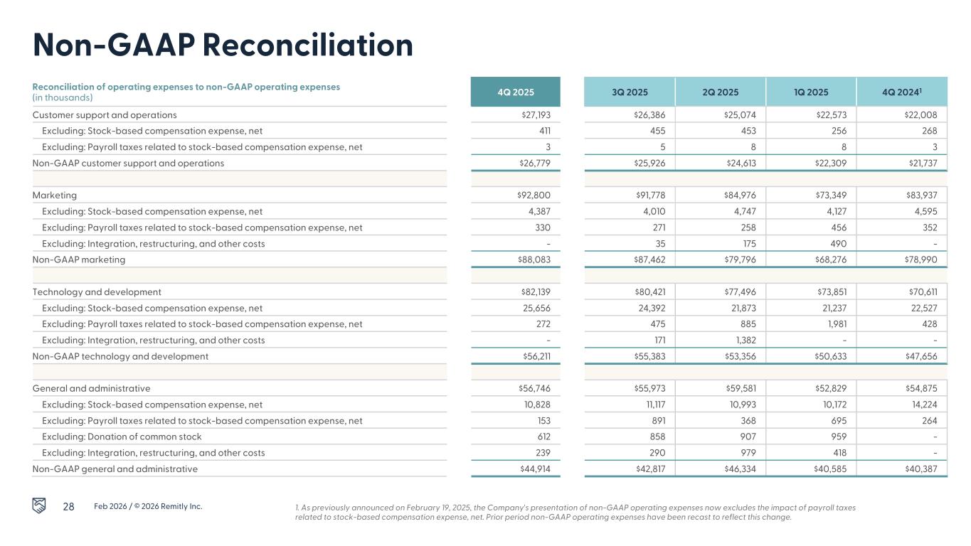 Feb 2026 / © 2026 Remitly Inc. Reconciliation of operating expenses to non-GAAP operating expenses (in thousands) 4Q 2025 3Q 2025 2Q 2025 1Q 2025 4Q 20241 Customer support and operations $27,193 $26,386 $25,074 $22,573 $22,008 Excluding: Stock-based compensation expense, net 411 455 453 256 268 Excluding: Payroll taxes related to stock-based compensation expense, net 3 5 8 8 3 Non-GAAP customer support and operations $26,779 $25,926 $24,613 $22,309 $21,737 Marketing $92,800 $91,778 $84,976 $73,349 $83,937 Excluding: Stock-based compensation expense, net 4,387 4,010 4,747 4,127 4,595 Excluding: Payroll taxes related to stock-based compensation expense, net 330 271 258 456 352 Excluding: Integration, restructuring, and other costs - 35 175 490 - Non-GAAP marketing $88,083 $87,462 $79,796 $68,276 $78,990 Technology and development $82,139 $80,421 $77,496 $73,851 $70,611 Excluding: Stock-based compensation expense, net 25,656 24,392 21,873 21,237 22,527 Excluding: Payroll taxes related to stock-based compensation expense, net 272 475 885 1,981 428 Excluding: Integration, restructuring, and other costs - 171 1,382 - - Non-GAAP technology and development $56,211 $55,383 $53,356 $50,633 $47,656 General and administrative $56,746 $55,973 $59,581 $52,829 $54,875 Excluding: Stock-based compensation expense, net 10,828 11,117 10,993 10,172 14,224 Excluding: Payroll taxes related to stock-based compensation expense, net 153 891 368 695 264 Excluding: Donation of common stock 612 858 907 959 - Excluding: Integration, restructuring, and other costs 239 290 979 418 - Non-GAAP general and administrative $44,914 $42,817 $46,334 $40,585 $40,387 Non-GAAP Reconciliation 28 1. As previously announced on February 19, 2025, the Company's presentation of non-GAAP operating expenses now excludes the impact of payroll taxes related to stock-based compensation expense, net. Prior period non-GAAP operating expenses have been recast to reflect this change.