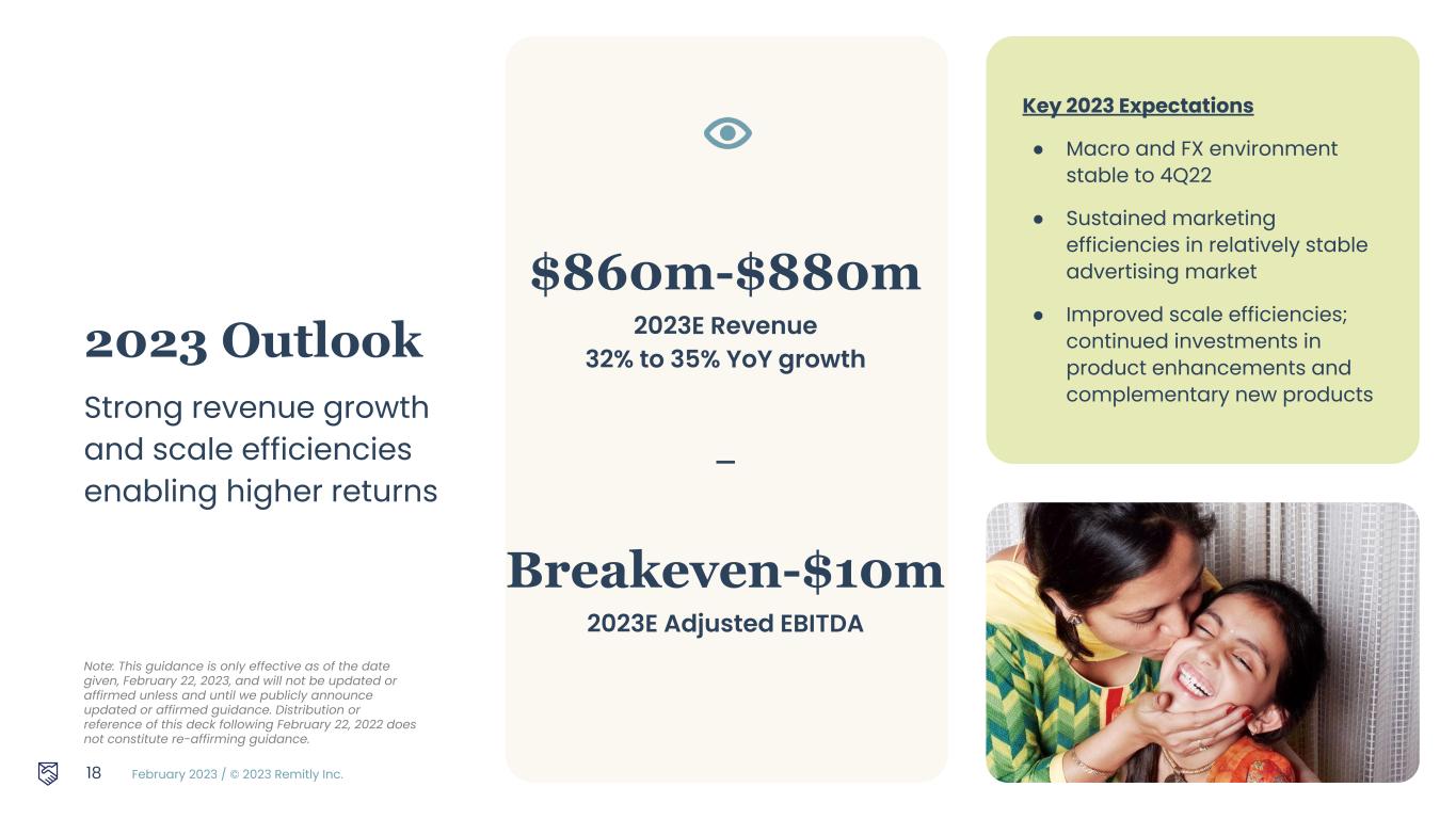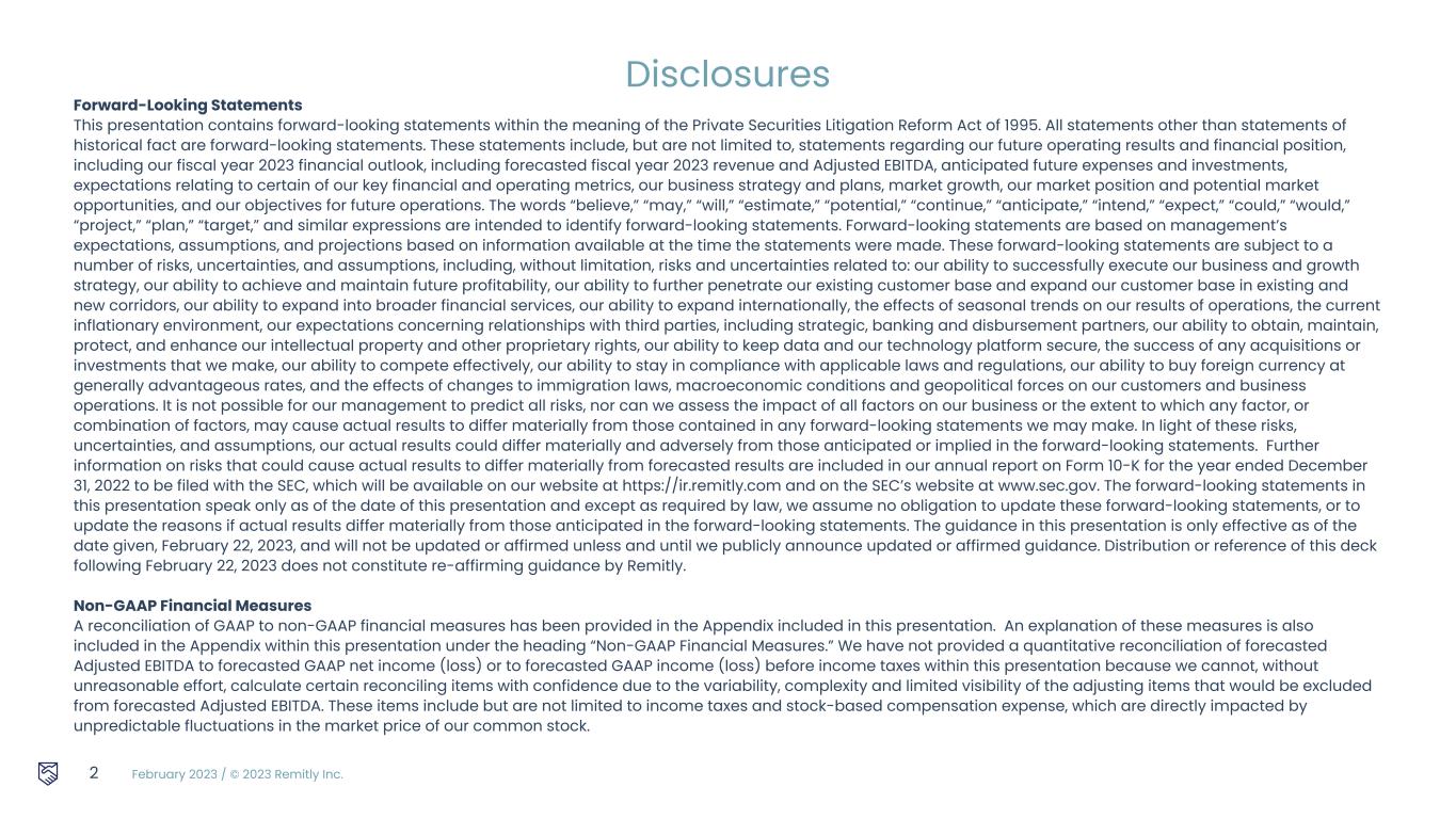February 2023 / © 2023 Remitly Inc. 2 Disclosures Forward-Looking Statements This presentation contains forward-looking statements within the meaning of the Private Securities Litigation Reform Act of 1995. All statements other than statements of historical fact are forward-looking statements. These statements include, but are not limited to, statements regarding our future operating results and financial position, including our fiscal year 2023 financial outlook, including forecasted fiscal year 2023 revenue and Adjusted EBITDA, anticipated future expenses and investments, expectations relating to certain of our key financial and operating metrics, our business strategy and plans, market growth, our market position and potential market opportunities, and our objectives for future operations. The words “believe,” “may,” “will,” “estimate,” “potential,” “continue,” “anticipate,” “intend,” “expect,” “could,” “would,” “project,” “plan,” “target,” and similar expressions are intended to identify forward-looking statements. Forward-looking statements are based on management’s expectations, assumptions, and projections based on information available at the time the statements were made. These forward-looking statements are subject to a number of risks, uncertainties, and assumptions, including, without limitation, risks and uncertainties related to: our ability to successfully execute our business and growth strategy, our ability to achieve and maintain future profitability, our ability to further penetrate our existing customer base and expand our customer base in existing and new corridors, our ability to expand into broader financial services, our ability to expand internationally, the effects of seasonal trends on our results of operations, the current inflationary environment, our expectations concerning relationships with third parties, including strategic, banking and disbursement partners, our ability to obtain, maintain, protect, and enhance our intellectual property and other proprietary rights, our ability to keep data and our technology platform secure, the success of any acquisitions or investments that we make, our ability to compete effectively, our ability to stay in compliance with applicable laws and regulations, our ability to buy foreign currency at generally advantageous rates, and the effects of changes to immigration laws, macroeconomic conditions and geopolitical forces on our customers and business operations. It is not possible for our management to predict all risks, nor can we assess the impact of all factors on our business or the extent to which any factor, or combination of factors, may cause actual results to differ materially from those contained in any forward-looking statements we may make. In light of these risks, uncertainties, and assumptions, our actual results could differ materially and adversely from those anticipated or implied in the forward-looking statements. Further information on risks that could cause actual results to differ materially from forecasted results are included in our annual report on Form 10-K for the year ended December 31, 2022 to be filed with the SEC, which will be available on our website at https://ir.remitly.com and on the SEC’s website at www.sec.gov. The forward-looking statements in this presentation speak only as of the date of this presentation and except as required by law, we assume no obligation to update these forward-looking statements, or to update the reasons if actual results differ materially from those anticipated in the forward-looking statements. The guidance in this presentation is only effective as of the date given, February 22, 2023, and will not be updated or affirmed unless and until we publicly announce updated or affirmed guidance. Distribution or reference of this deck following February 22, 2023 does not constitute re-affirming guidance by Remitly. Non-GAAP Financial Measures A reconciliation of GAAP to non-GAAP financial measures has been provided in the Appendix included in this presentation. An explanation of these measures is also included in the Appendix within this presentation under the heading “Non-GAAP Financial Measures.” We have not provided a quantitative reconciliation of forecasted Adjusted EBITDA to forecasted GAAP net income (loss) or to forecasted GAAP income (loss) before income taxes within this presentation because we cannot, without unreasonable effort, calculate certain reconciling items with confidence due to the variability, complexity and limited visibility of the adjusting items that would be excluded from forecasted Adjusted EBITDA. These items include but are not limited to income taxes and stock-based compensation expense, which are directly impacted by unpredictable fluctuations in the market price of our common stock.