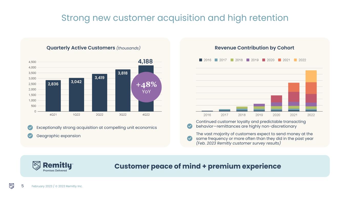 February 2023 / © 2023 Remitly Inc. Resilient and predictable customer behavior Customer experience getting even better with scale Consistent track record of beating expectations/execution Focused on increasing returns on investments 4 Resilient customers, premium product and increasing returns on investments $191m4Q22 REVENUE Adjusted EBITDA is a non-GAAP measure. Please see reconciliation of non-GAAP measures to the most comparable GAAP measures in the Appendix. 41% YoY 4Q22 PROFITABILITY ($19m) GAAP Net Loss $7.5m Adjusted EBITDA