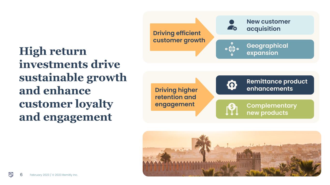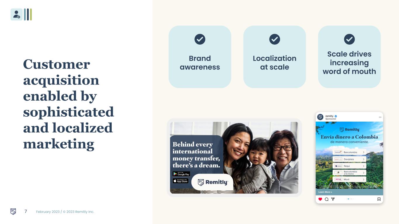 February 2023 / © 2023 Remitly Inc. High return investments drive sustainable growth and enhance customer loyalty and engagement 6 New customer acquisition Geographical expansion Driving efficient customer growth Remittance product enhancements Complementary new products Driving higher retention and engagement