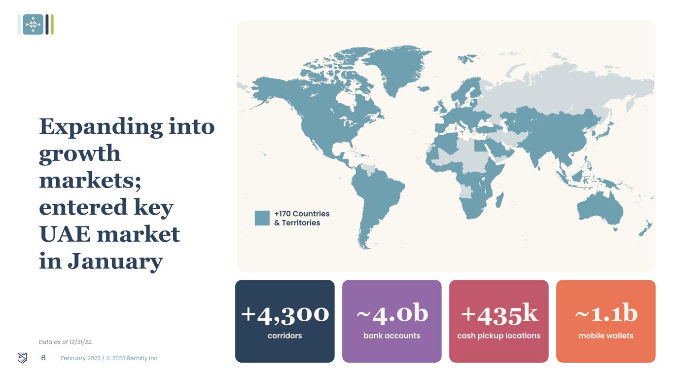 February 2023 / © 2023 Remitly Inc. Expanding into growth markets; entered key UAE market in January 8 +4,300 corridors ~4.0b bank accounts +435k cash pickup locations ~1.1b mobile wallets +170 Countries & Territories Data as of 12/31/22. https://mapchart.net/world.html 4Q22: {"groups":{"#cc3333":{"label":"","paths":["United_States","Philippines","India","Mexico","Guatemala"," El_Salvador","Honduras","Colombia","Ecuador","Nicaragua","Peru","Dominican_Republic","Vietnam ","Nigeria","Argentina","Bolivia","Brazil","Chile","Costa_Rica","Paraguay","Uruguay","Ethiopia","Keny a","South_Africa","Pakistan","Panama","Tunisia","Rwanda","Senegal","Morocco","Albania","Nepal"," Bangladesh","Indonesia","Romania","Malaysia","Thailand","Poland","Algeria","Bulgaria","Croatia","Sr i_Lanka","Haiti","Ghana","Czechia","Egypt","Jamaica","Uganda","China","South_Korea","Moldova"," Ukraine","Armenia","Tanzania","Cote_d_Ivoire","Cameroon","Guyana","Georgia","Israel","Suriname" ,"Lithuania","Montenegro","Laos","Cambodia","Cyprus","Greece","Kosovo","North_Macedonia","Uzb ekistan","Benin","Togo","Gabon","Kyrgyzstan","Jordan","Bahamas","Gambia","Guinea","Sierra_Leon e","Burundi","Myanmar","Zambia","Malawi","Fiji","Estonia","Madagascar","Slovakia","Japan","Sloveni a","Latvia","Malta","Andorra","Monaco","Iceland","Zimbabwe","Equatorial_Guinea","Guinea_Bissau", "Samoa","Congo","Mauritius","Kazakhstan","Mozambique","Bosnia_and_Herzegovina","Djibouti","M ongolia","Botswana","Cabo_Verde","Azerbaijan","Bhutan","Namibia","Turkmenistan","Liberia","DR_ Congo","Tajikistan","Lebanon","Eritrea","Mauritania","France","Brunei","Dominica","Trinidad_and_To bago","Antigua_and_Barbuda","Luxembourg","Timor_Leste","Saudi_Arabia","Hong_Kong","Lesotho" ,"Hungary","Qatar","Oman","Bahrain","Papua_New_Guinea","Kuwait","Belize","Switzerland","Solom on_Islands","Puerto_Rico","Serbia","Somalia","Vanuatu","Ireland","Türkiye","Germany","Austria","Fin land","Belgium","Italy","Spain","Netherlands","Norway","Denmark","Sweden","Portugal","Canada","A ustralia","United_Kingdom","Singapore","New_Zealand"]}},"title":"","hidden":["Prince_Edward_Island _CA","New_Brunswick_CA","Ontario_CA","British_Columbia_CA","Alberta_CA","Saskatchewan_CA ","Manitoba_CA","Quebec_CA","Yukon_CA","Nunavut_CA","Newfoundland_and_Labrador_CA","No rthwest_Territories_CA","Nova_Scotia_CA","USA_Wisconsin","USA_Montana","USA_Minnesota","U SA_Washington","USA_Idaho","USA_North_Dakota","USA_Michigan","USA_Maine","USA_Ohio","U SA_New_Hampshire","USA_New_York","USA_Vermont","USA_Pennsylvania","USA_Arizona","US A_California","USA_New_Mexico","USA_Texas","USA_Alaska","USA_Louisiana","USA_Mississippi" ,"USA_Alabama","USA_Florida","USA_Georgia","USA_South_Carolina","USA_North_Carolina","US A_Virginia","USA_Washington_DC","USA_Maryland","USA_Delaware","USA_New_Jersey","USA_C onnecticut","USA_Rhode_Island","USA_Massachusetts","USA_Oregon","USA_Hawaii","USA_Utah" ,"USA_Wyoming","USA_Nevada","USA_Colorado","USA_South_Dakota","USA_Nebraska","USA_K ansas","USA_Oklahoma","USA_Iowa","USA_Missouri","USA_Illinois","USA_Kentucky","USA_Arkan sas","USA_Tennessee","USA_West_Virginia","USA_Indiana","Scotland","Wales","England","Norther n_Ireland"],"background":"#fff","borders":"#000","legendFont":"Century Gothic","legendFontColor":"#000","legendBgColor":"#00000000","areBordersShown":true,"defaultCo lor":"#d1dbdd","labelsColor":"#6a0707","strokeWidth":"medium","areLabelsShown":true,"usaStatesS hown":false,"canadaStatesShown":false,"splitUK":false,"legendPosition":"bottom_left","legendSize":" medium","legendStatus":"show","scalingPatterns":true,"legendRowsSameColor":true,"legendColum nCount":1} Updated 4Q22: {"groups":{"#cc3333":{"label":"","paths":["United_States","Philippines","I ndia","Mexico","Guatemala","El_Salvador","Honduras","Colombia","Ecu ador","Nicaragua","Peru","Dominican_Republic","Vietnam","Nigeria","Ar gentina","Bolivia","Brazil","Chile","Costa_Rica","Paraguay","Uruguay","E thiopia","Kenya","South_Africa","Pakistan","Panama","Tunisia","Rwand a","Senegal","Morocco","Albania","Nepal","Bangladesh","Indonesia","Ro mania","Malaysia","Thailand","Poland","Algeria","Bulgaria","Croatia","Sri _Lanka","Haiti","Ghana","Czechia","Egypt","Jamaica","Uganda","China" ,"South_Korea","Moldova","Ukraine","Armenia","Tanzania","Cote_d_Ivoi re","Cameroon","Guyana","Georgia","Israel","Suriname","Lithuania","Mo ntenegro","Laos","Cambodia","Cyprus","Greece","Kosovo","North_Mace donia","Uzbekistan","Benin","Togo","Gabon","Kyrgyzstan","Jordan","Ba hamas","Gambia","Guinea","Sierra_Leone","Burundi","Myanmar","Zamb ia","Malawi","Fiji","Estonia","Madagascar","Slovakia","Japan","Slovenia" ,"Latvia","Malta","Andorra","Monaco","Iceland","Zimbabwe","Equatorial_ Guinea","Guinea_Bissau","Samoa","Congo","Mauritius","Kazakhstan"," Mozambique","Bosnia_and_Herzegovina","Djibouti","Mongolia","Botswa na","Cabo_Verde","Azerbaijan","Bhutan","Namibia","Turkmenistan","Lib eria","DR_Congo","Tajikistan","Lebanon","Eritrea","Mauritania","France" ,"Brunei","Dominica","Trinidad_and_Tobago","Antigua_and_Barbuda"," Luxembourg","Timor_Leste","Saudi_Arabia","Hong_Kong","Lesotho","H ungary","Qatar","Oman","Bahrain","Papua_New_Guinea","Kuwait","Beli ze","Switzerland","Solomon_Islands","Puerto_Rico","Serbia","Somalia"," Vanuatu","Ireland","Türkiye","Germany","Austria","Finland","Belgium","It aly","Spain","Netherlands","Norway","Denmark","Sweden","Portugal","C anada","Australia","United_Kingdom","Singapore","New_Zealand","Gre enland","French_Guiana"]}},"title":"","hidden":["Prince_Edward_Island_ CA","New_Brunswick_CA","Ontario_CA","British_Columbia_CA","Albert a_CA","Saskatchewan_CA","Manitoba_CA","Quebec_CA","Yukon_CA", "Nunavut_CA","Newfoundland_and_Labrador_CA","Northwest_Territori es_CA","Nova_Scotia_CA","USA_Wisconsin","USA_Montana","USA_M innesota","USA_Washington","USA_Idaho","USA_North_Dakota","USA _Michigan","USA_Maine","USA_Ohio","USA_New_Hampshire","USA_ New_York","USA_Vermont","USA_Pennsylvania","USA_Arizona","USA _California","USA_New_Me