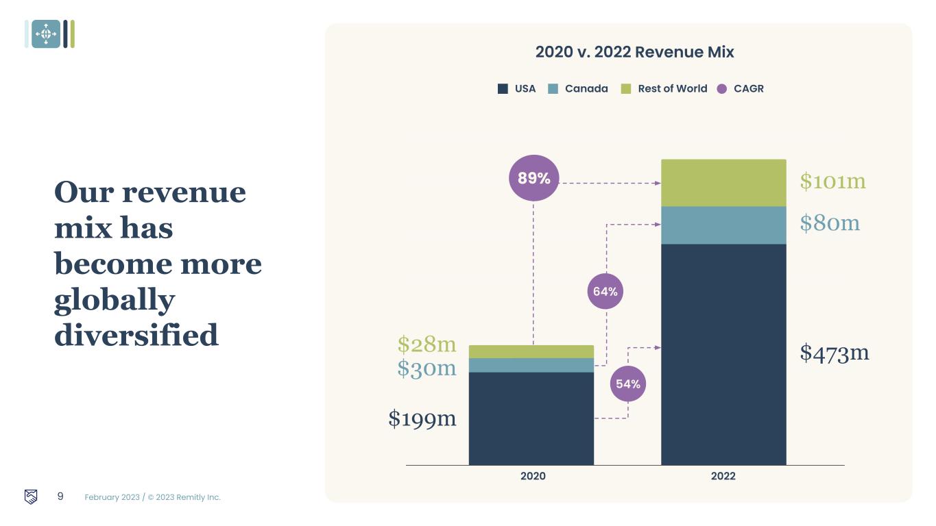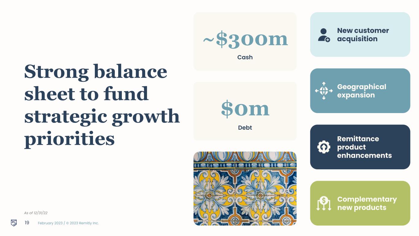 February 2023 / © 2023 Remitly Inc. Complementary new products Remittance product enhancements Geographical expansion New customer acquisition Strong balance sheet to fund strategic growth priorities As of 12/31/22 ~$300m Cash 19 $0m Debt