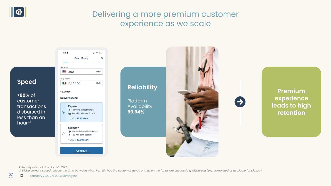 February 2023 / © 2023 Remitly Inc. Our revenue mix has become more globally diversified 2020 v. 2022 Revenue Mix 9 2020 2022 $199m 77% CAGR USA Canada Rest of World $30m $28m $473m $80m $101m CAGR 54% 64% 89%