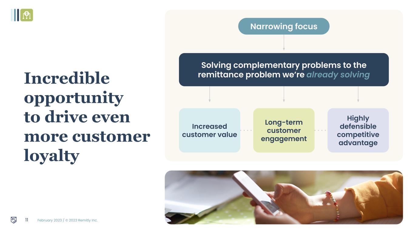 February 2023 / © 2023 Remitly Inc. 10 In 2022, 25% of customers resolved issues via self help vs. 4.7% in 2016 - How about this: Use of self help has increased 5x since 2016 90% of transactions delivered in less than an hour - X% of transactions are express (either 4Q or 2022 data) Perfect Delivery Promise has improved 200 bps since 2018 Delivering a more premium customer experience as we scale Speed >90% of customer transactions disbursed in less than an hour1,2 Premium experience leads to high retention Reliability Platform Availability 99.94%1 1. Remitly internal data for 4Q 2022. 2. Disbursement speed reflects the time between when Remitly has the customer funds and when the funds are successfully disbursed (e.g. completed or available for pickup)