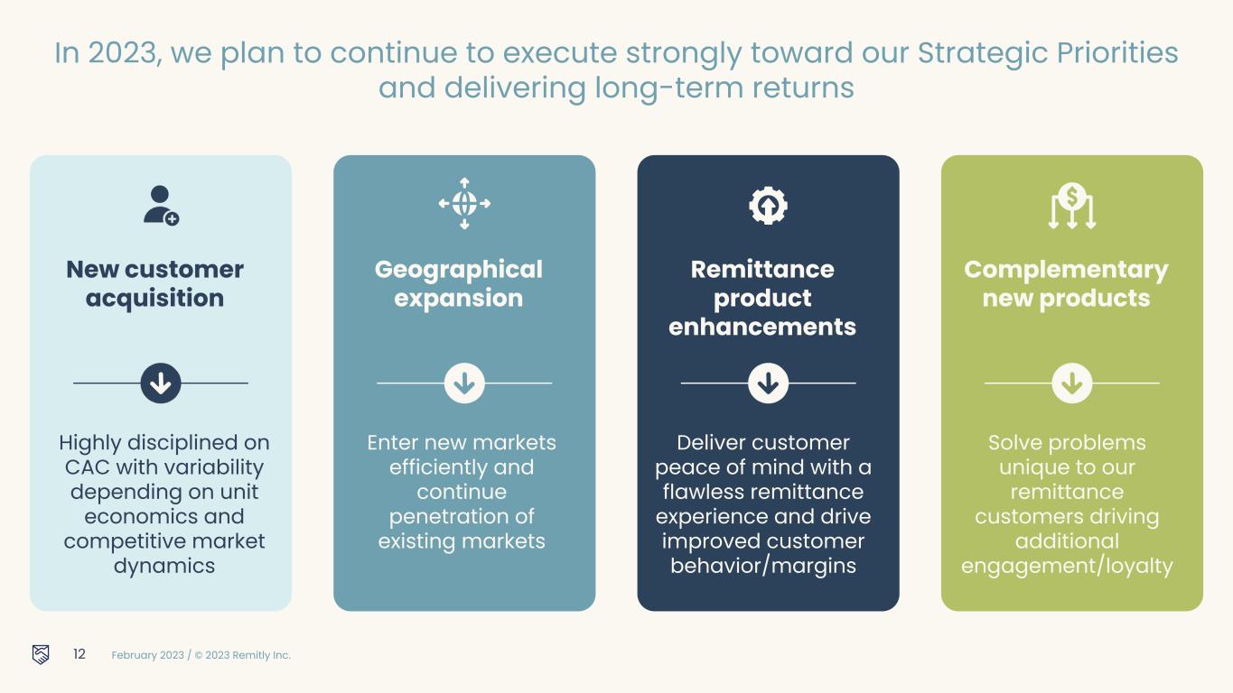February 2023 / © 2023 Remitly Inc. Incredible opportunity to drive even more customer loyalty 11 Solving complementary problems to the remittance problem we’re already solving Narrowing focus Increased customer value Long-term customer engagement Highly defensible competitive advantage