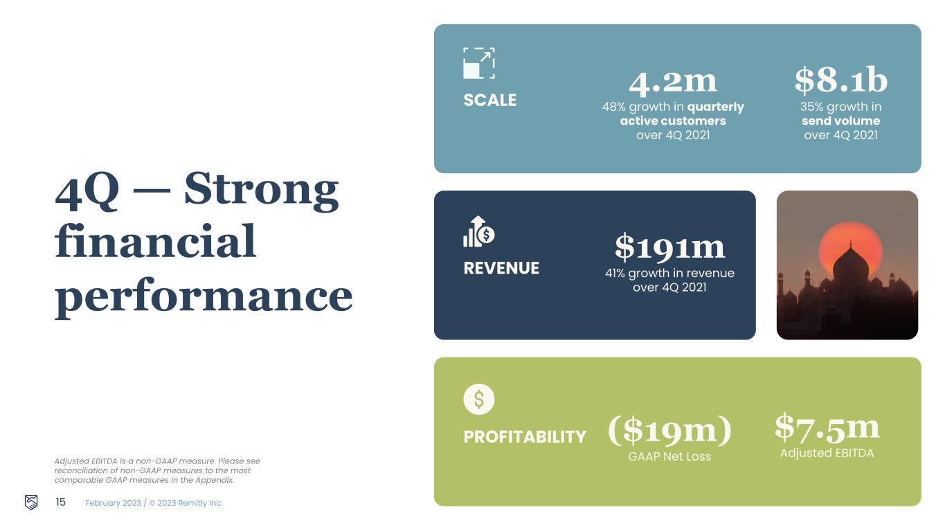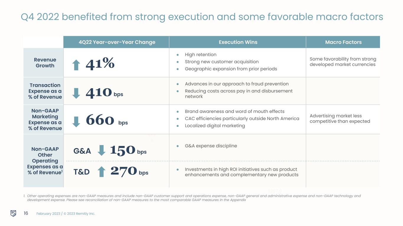 February 2023 / © 2023 Remitly Inc. 4Q — Strong financial performance SCALE 4.2m 48% growth in quarterly active customers over 4Q 2021 $8.1b 35% growth in send volume over 4Q 2021 REVENUE $191m 41% growth in revenue over 4Q 2021 15 PROFITABILITY ($19m) GAAP Net Loss $7.5m Adjusted EBITDA Adjusted EBITDA is a non-GAAP measure. Please see reconciliation of non-GAAP measures to the most comparable GAAP measures in the Appendix.
