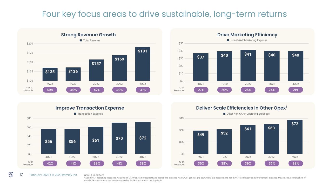 February 2023 / © 2023 Remitly Inc. 1. Other operating expenses are non-GAAP measures and include non-GAAP customer support and operations expense, non-GAAP general and administrative expense and non-GAAP technology and development expense. Please see reconciliation of non-GAAP measures to the most comparable GAAP measures in the Appendix $257.0 4Q22 Year-over-Year Change Execution Wins Macro Factors Revenue Growth 41% ● High retention ● Strong new customer acquisition ● Geographic expansion from prior periods Some favorability from strong developed market currencies Transaction Expense as a % of Revenue 410 bps ● Advances in our approach to fraud prevention ● Reducing costs across pay in and disbursement network Non-GAAP Marketing Expense as a % of Revenue 660 bps ● Brand awareness and word of mouth effects ● CAC efficiencies particularly outside North America ● Localized digital marketing Advertising market less competitive than expected Non-GAAP Other Operating Expenses as a % of Revenue1 G&A 150 bps T&D 270 bps Q4 2022 benefited from strong execution and some favorable macro factors 16 DESIGN TWEAKS PENDING CONTENT APPROVAL ● G&A expense discipline ● Investments in high ROI initiatives such as product enhancements and complementary new products