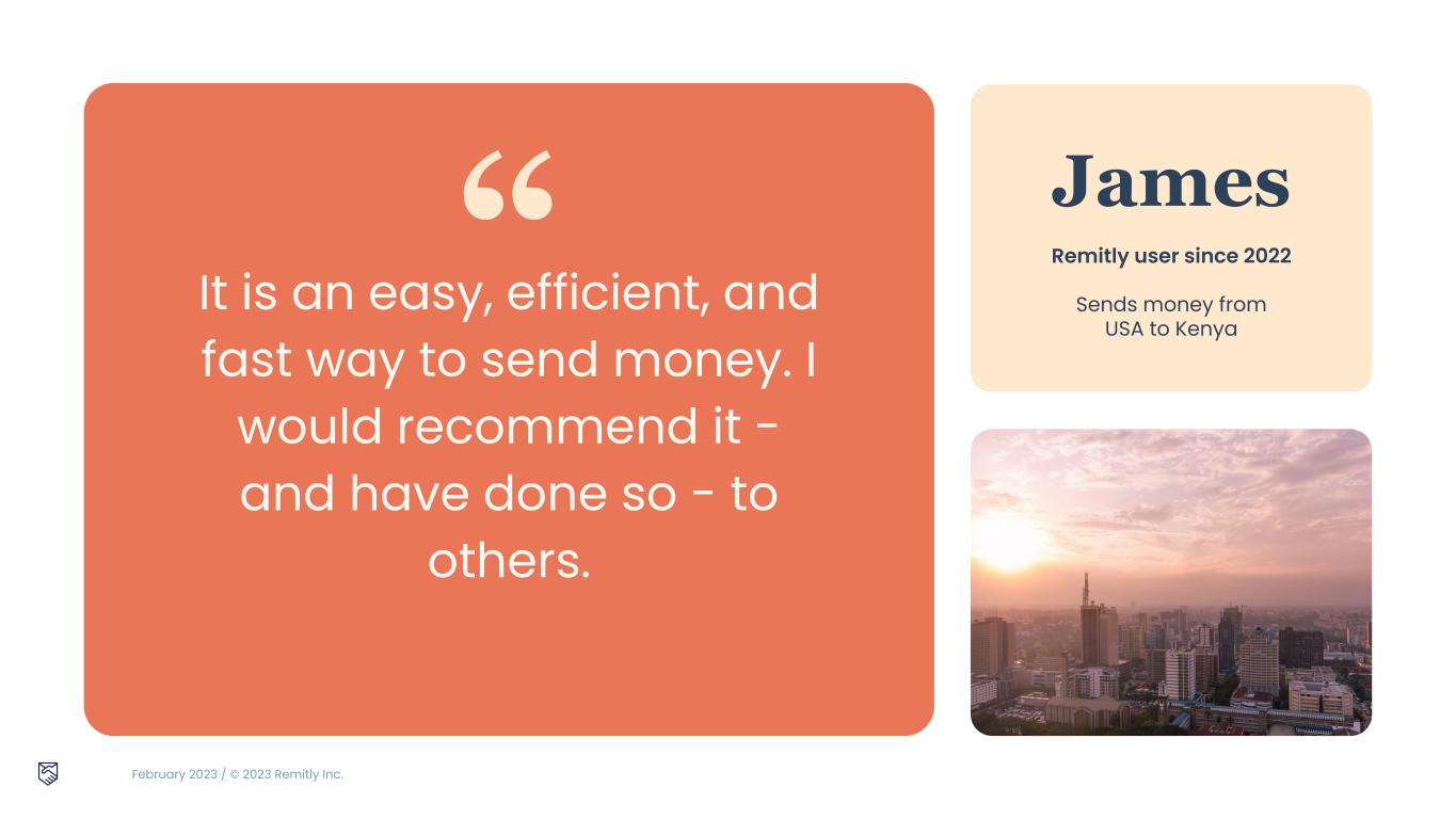 February 2023 / © 2023 Remitly Inc. “ James Remitly user since 2022 Sends money from USA to Kenya It is an easy, efficient, and fast way to send money. I would recommend it - and have done so - to others.