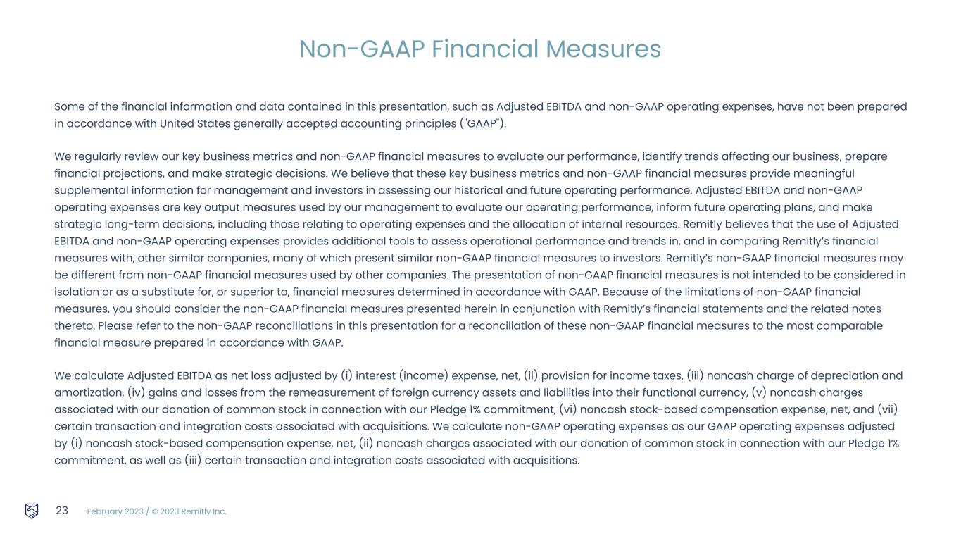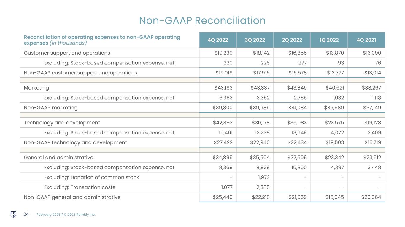 February 2023 / © 2023 Remitly Inc. Some of the financial information and data contained in this presentation, such as Adjusted EBITDA and non-GAAP operating expenses, have not been prepared in accordance with United States generally accepted accounting principles ("GAAP"). We regularly review our key business metrics and non-GAAP financial measures to evaluate our performance, identify trends affecting our business, prepare financial projections, and make strategic decisions. We believe that these key business metrics and non-GAAP financial measures provide meaningful supplemental information for management and investors in assessing our historical and future operating performance. Adjusted EBITDA and non-GAAP operating expenses are key output measures used by our management to evaluate our operating performance, inform future operating plans, and make strategic long-term decisions, including those relating to operating expenses and the allocation of internal resources. Remitly believes that the use of Adjusted EBITDA and non-GAAP operating expenses provides additional tools to assess operational performance and trends in, and in comparing Remitly’s financial measures with, other similar companies, many of which present similar non-GAAP financial measures to investors. Remitly’s non-GAAP financial measures may be different from non-GAAP financial measures used by other companies. The presentation of non-GAAP financial measures is not intended to be considered in isolation or as a substitute for, or superior to, financial measures determined in accordance with GAAP. Because of the limitations of non-GAAP financial measures, you should consider the non-GAAP financial measures presented herein in conjunction with Remitly’s financial statements and the related notes thereto. Please refer to the non-GAAP reconciliations in this presentation for a reconciliation of these non-GAAP financial measures to the most comparable financial measure prepared in accordance with GAAP. We calculate Adjusted EBITDA as net loss adjusted by (i) interest (income) expense, net, (ii) provision for income taxes, (iii) noncash charge of depreciation and amortization, (iv) gains and losses from the remeasurement of foreign currency assets and liabilities into their functional currency, (v) noncash charges associated with our donation of common stock in connection with our Pledge 1% commitment, (vi) noncash stock-based compensation expense, net, and (vii) certain transaction and integration costs associated with acquisitions. We calculate non-GAAP operating expenses as our GAAP operating expenses adjusted by (i) noncash stock-based compensation expense, net, (ii) noncash charges associated with our donation of common stock in connection with our Pledge 1% commitment, as well as (iii) certain transaction and integration costs associated with acquisitions. 23 Non-GAAP Financial Measures