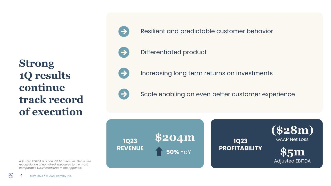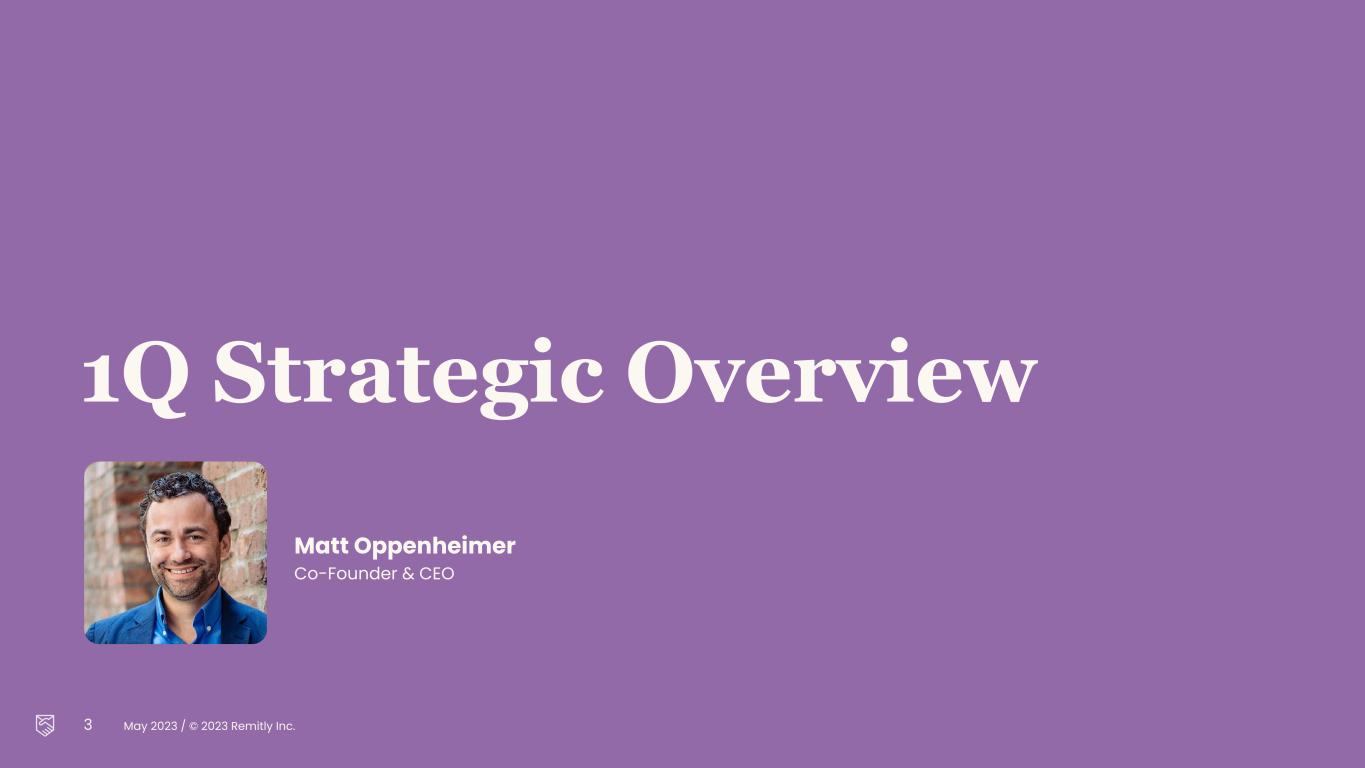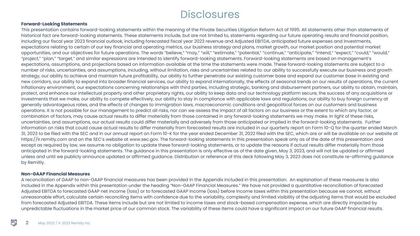 May 2023 / © 2023 Remitly Inc. 2 Disclosures Forward-Looking Statements This presentation contains forward-looking statements within the meaning of the Private Securities Litigation Reform Act of 1995. All statements other than statements of historical fact are forward-looking statements. These statements include, but are not limited to, statements regarding our future operating results and financial position, including our fiscal year 2023 financial outlook, including forecasted fiscal year 2023 revenue and Adjusted EBITDA, anticipated future expenses and investments, expectations relating to certain of our key financial and operating metrics, our business strategy and plans, market growth, our market position and potential market opportunities, and our objectives for future operations. The words “believe,” “may,” “will,” “estimate,” “potential,” “continue,” “anticipate,” “intend,” “expect,” “could,” “would,” “project,” “plan,” “target,” and similar expressions are intended to identify forward-looking statements. Forward-looking statements are based on management’s expectations, assumptions, and projections based on information available at the time the statements were made. These forward-looking statements are subject to a number of risks, uncertainties, and assumptions, including, without limitation, risks and uncertainties related to: our ability to successfully execute our business and growth strategy, our ability to achieve and maintain future profitability, our ability to further penetrate our existing customer base and expand our customer base in existing and new corridors, our ability to expand into broader financial services, our ability to expand internationally, the effects of seasonal trends on our results of operations, the current inflationary environment, our expectations concerning relationships with third parties, including strategic, banking and disbursement partners, our ability to obtain, maintain, protect, and enhance our intellectual property and other proprietary rights, our ability to keep data and our technology platform secure, the success of any acquisitions or investments that we make, our ability to compete effectively, our ability to stay in compliance with applicable laws and regulations, our ability to buy foreign currency at generally advantageous rates, and the effects of changes to immigration laws, macroeconomic conditions and geopolitical forces on our customers and business operations. It is not possible for our management to predict all risks, nor can we assess the impact of all factors on our business or the extent to which any factor, or combination of factors, may cause actual results to differ materially from those contained in any forward-looking statements we may make. In light of these risks, uncertainties, and assumptions, our actual results could differ materially and adversely from those anticipated or implied in the forward-looking statements. Further information on risks that could cause actual results to differ materially from forecasted results are included in our quarterly report on Form 10-Q for the quarter ended March 31, 2023 to be filed with the SEC and in our annual report on Form 10-K for the year ended December 31, 2022 filed with the SEC, which are or will be available on our website at https://ir.remitly.com and on the SEC’s website at www.sec.gov. The forward-looking statements in this presentation speak only as of the date of this presentation and except as required by law, we assume no obligation to update these forward-looking statements, or to update the reasons if actual results differ materially from those anticipated in the forward-looking statements. The guidance in this presentation is only effective as of the date given, May 3, 2023, and will not be updated or affirmed unless and until we publicly announce updated or affirmed guidance. Distribution or reference of this deck following May 3, 2023 does not constitute re-affirming guidance by Remitly. Non-GAAP Financial Measures A reconciliation of GAAP to non-GAAP financial measures has been provided in the Appendix included in this presentation. An explanation of these measures is also included in the Appendix within this presentation under the heading “Non-GAAP Financial Measures.” We have not provided a quantitative reconciliation of forecasted Adjusted EBITDA to forecasted GAAP net income (loss) or to forecasted GAAP income (loss) before income taxes within this presentation because we cannot, without unreasonable effort, calculate certain reconciling items with confidence due to the variability, complexity and limited visibility of the adjusting items that would be excluded from forecasted Adjusted EBITDA. These items include but are not limited to income taxes and stock-based compensation expense, which are directly impacted by unpredictable fluctuations in the market price of our common stock. The variability of these items could have a significant impact on our future GAAP financial results.