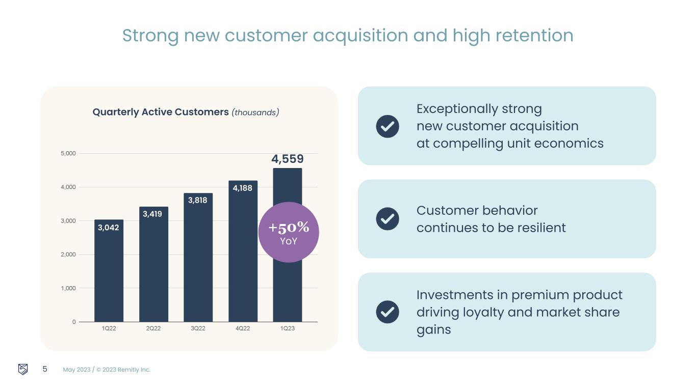 May 2023 / © 2023 Remitly Inc. Resilient and predictable customer behavior Differentiated product Increasing long term returns on investments Scale enabling an even better customer experience 4 Strong 1Q results continue track record of execution $204m1Q23 REVENUE Adjusted EBITDA is a non-GAAP measure. Please see reconciliation of non-GAAP measures to the most comparable GAAP measures in the Appendix. 50% YoY 1Q23 PROFITABILITY ($28m) GAAP Net Loss $5m Adjusted EBITDA