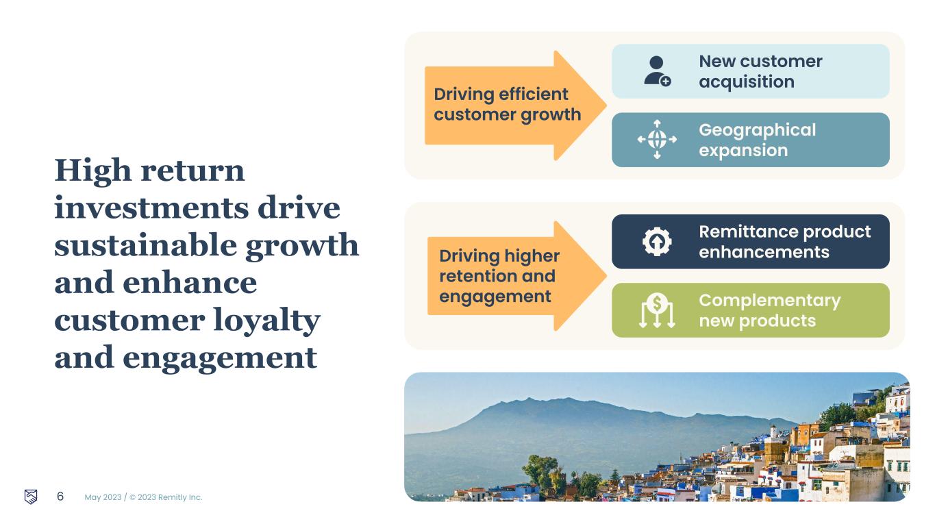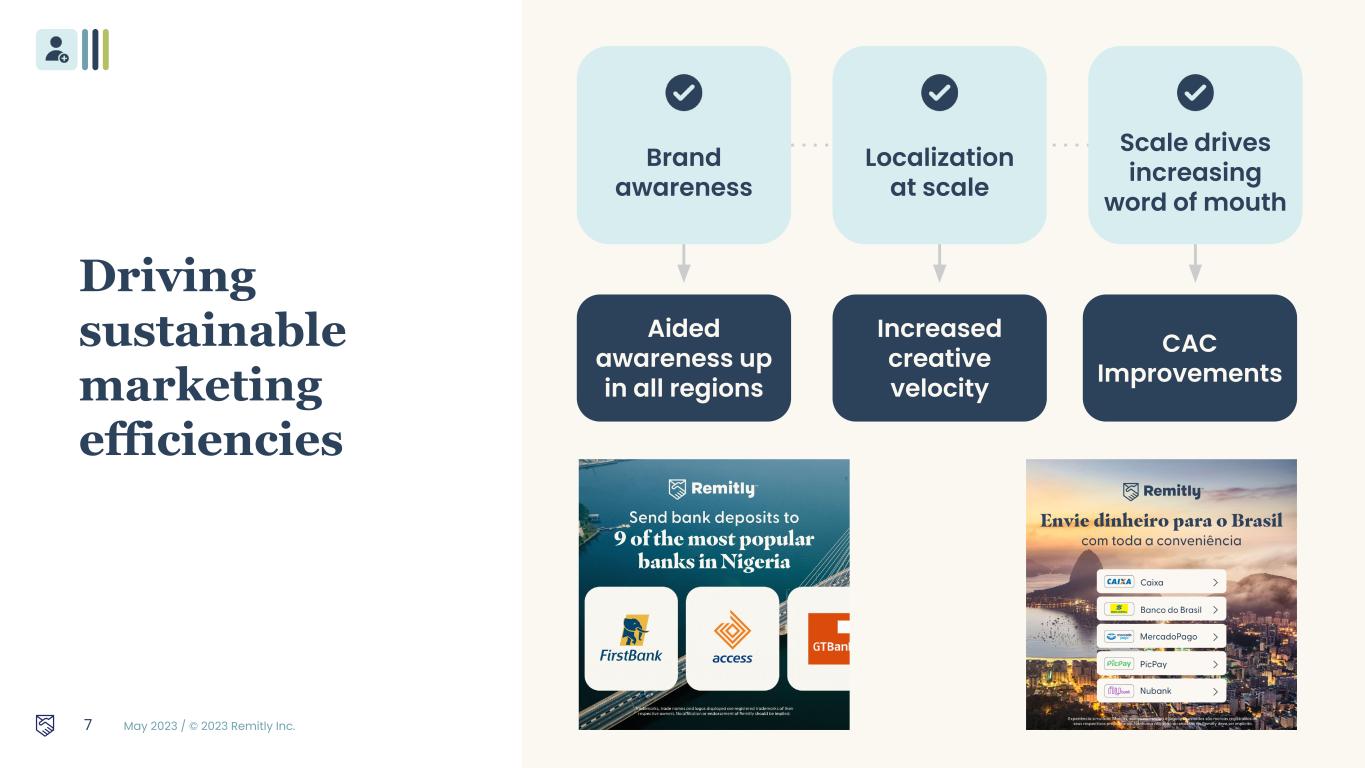 May 2023 / © 2023 Remitly Inc. 6 New customer acquisition Geographical expansion Driving efficient customer growth Remittance product enhancements Complementary new products Driving higher retention and engagement High return investments drive sustainable growth and enhance customer loyalty and engagement