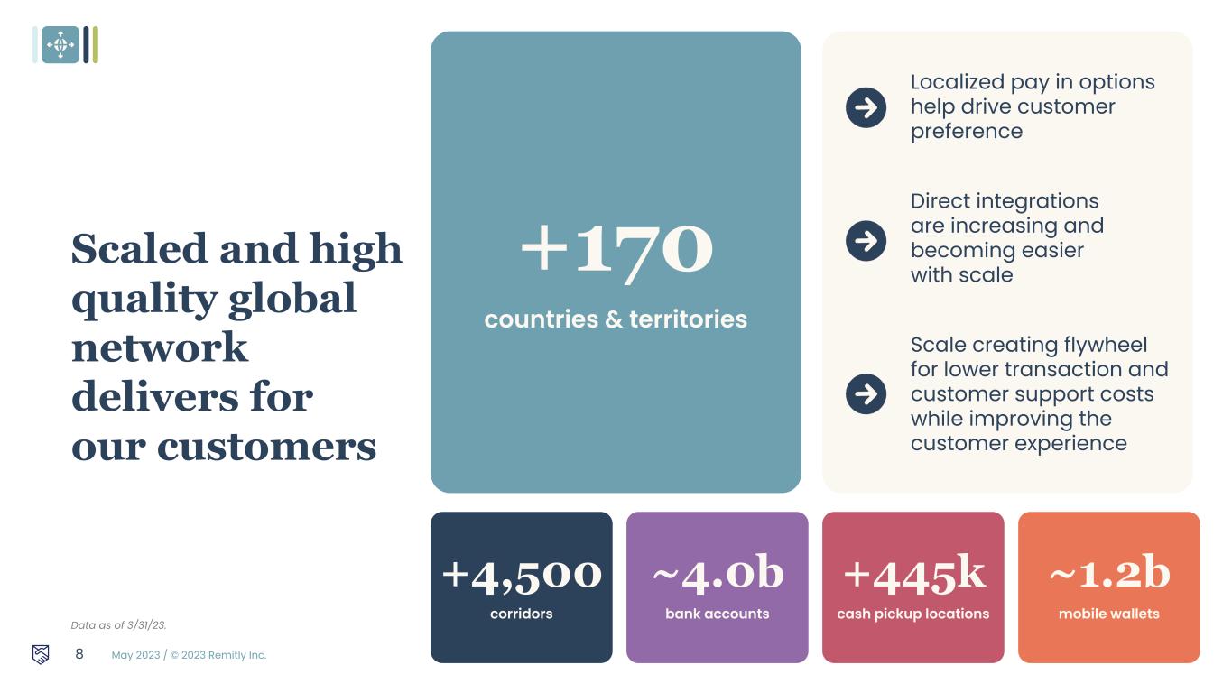 May 2023 / © 2023 Remitly Inc. 7 Brand awareness Scale drives increasing word of mouth Aided awareness up in all regions Increased creative velocity CAC Improvements Driving sustainable marketing efficiencies Localization at scale
