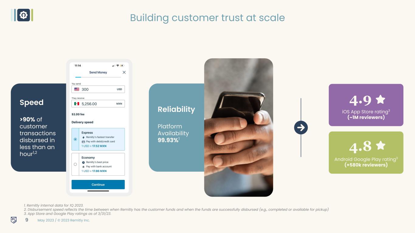 May 2023 / © 2023 Remitly Inc. 8 +4,500 corridors ~4.0b bank accounts +445k cash pickup locations ~1.2b mobile wallets Data as of 3/31/23. https://mapchart.net/world.html 4Q22: {"groups":{"#cc3333":{"label":"","paths":["United_States","Philippines","India","Mexico","Guatemala"," El_Salvador","Honduras","Colombia","Ecuador","Nicaragua","Peru","Dominican_Republic","Vietnam ","Nigeria","Argentina","Bolivia","Brazil","Chile","Costa_Rica","Paraguay","Uruguay","Ethiopia","Keny a","South_Africa","Pakistan","Panama","Tunisia","Rwanda","Senegal","Morocco","Albania","Nepal"," Bangladesh","Indonesia","Romania","Malaysia","Thailand","Poland","Algeria","Bulgaria","Croatia","Sr i_Lanka","Haiti","Ghana","Czechia","Egypt","Jamaica","Uganda","China","South_Korea","Moldova"," Ukraine","Armenia","Tanzania","Cote_d_Ivoire","Cameroon","Guyana","Georgia","Israel","Suriname" ,"Lithuania","Montenegro","Laos","Cambodia","Cyprus","Greece","Kosovo","North_Macedonia","Uzb ekistan","Benin","Togo","Gabon","Kyrgyzstan","Jordan","Bahamas","Gambia","Guinea","Sierra_Leon e","Burundi","Myanmar","Zambia","Malawi","Fiji","Estonia","Madagascar","Slovakia","Japan","Sloveni a","Latvia","Malta","Andorra","Monaco","Iceland","Zimbabwe","Equatorial_Guinea","Guinea_Bissau", "Samoa","Congo","Mauritius","Kazakhstan","Mozambique","Bosnia_and_Herzegovina","Djibouti","M ongolia","Botswana","Cabo_Verde","Azerbaijan","Bhutan","Namibia","Turkmenistan","Liberia","DR_ Congo","Tajikistan","Lebanon","Eritrea","Mauritania","France","Brunei","Dominica","Trinidad_and_To bago","Antigua_and_Barbuda","Luxembourg","Timor_Leste","Saudi_Arabia","Hong_Kong","Lesotho" ,"Hungary","Qatar","Oman","Bahrain","Papua_New_Guinea","Kuwait","Belize","Switzerland","Solom on_Islands","Puerto_Rico","Serbia","Somalia","Vanuatu","Ireland","Türkiye","Germany","Austria","Fin land","Belgium","Italy","Spain","Netherlands","Norway","Denmark","Sweden","Portugal","Canada","A ustralia","United_Kingdom","Singapore","New_Zealand"]}},"title":"","hidden":["Prince_Edward_Island _CA","New_Brunswick_CA","Ontario_CA","British_Columbia_CA","Alberta_CA","Saskatchewan_CA ","Manitoba_CA","Quebec_CA","Yukon_CA","Nunavut_CA","Newfoundland_and_Labrador_CA","No rthwest_Territories_CA","Nova_Scotia_CA","USA_Wisconsin","USA_Montana","USA_Minnesota","U SA_Washington","USA_Idaho","USA_North_Dakota","USA_Michigan","USA_Maine","USA_Ohio","U SA_New_Hampshire","USA_New_York","USA_Vermont","USA_Pennsylvania","USA_Arizona","US A_California","USA_New_Mexico","USA_Texas","USA_Alaska","USA_Louisiana","USA_Mississippi" ,"USA_Alabama","USA_Florida","USA_Georgia","USA_South_Carolina","USA_North_Carolina","US A_Virginia","USA_Washington_DC","USA_Maryland","USA_Delaware","USA_New_Jersey","USA_C onnecticut","USA_Rhode_Island","USA_Massachusetts","USA_Oregon","USA_Hawaii","USA_Utah" ,"USA_Wyoming","USA_Nevada","USA_Colorado","USA_South_Dakota","USA_Nebraska","USA_K ansas","USA_Oklahoma","USA_Iowa","USA_Missouri","USA_Illinois","USA_Kentucky","USA_Arkan sas","USA_Tennessee","USA_West_Virginia","USA_Indiana","Scotland","Wales","England","Norther n_Ireland"],"background":"#fff","borders":"#000","legendFont":"Century Gothic","legendFontColor":"#000","legendBgColor":"#00000000","areBordersShown":true,"defaultCo lor":"#d1dbdd","labelsColor":"#6a0707","strokeWidth":"medium","areLabelsShown":true,"usaStatesS hown":false,"canadaStatesShown":false,"splitUK":false,"legendPosition":"bottom_left","legendSize":" medium","legendStatus":"show","scalingPatterns":true,"legendRowsSameColor":true,"legendColum nCount":1} Updated 4Q22: {"groups":{"#cc3333":{"label":"","paths":["United_States","Philippines","I ndia","Mexico","Guatemala","El_Salvador","Honduras","Colombia","Ecu ador","Nicaragua","Peru","Dominican_Republic","Vietnam","Nigeria","Ar gentina","Bolivia","Brazil","Chile","Costa_Rica","Paraguay","Uruguay","E thiopia","Kenya","South_Africa","Pakistan","Panama","Tunisia","Rwand a","Senegal","Morocco","Albania","Nepal","Bangladesh","Indonesia","Ro mania","Malaysia","Thailand","Poland","Algeria","Bulgaria","Croatia","Sri _Lanka","Haiti","Ghana","Czechia","Egypt","Jamaica","Uganda","China" ,"South_Korea","Moldova","Ukraine","Armenia","Tanzania","Cote_d_Ivoi re","Cameroon","Guyana","Georgia","Israel","Suriname","Lithuania","Mo ntenegro","Laos","Cambodia","Cyprus","Greece","Kosovo","North_Mace donia","Uzbekistan","Benin","Togo","Gabon","Kyrgyzstan","Jordan","Ba hamas","Gambia","Guinea","Sierra_Leone","Burundi","Myanmar","Zamb ia","Malawi","Fiji","Estonia","Madagascar","Slovakia","Japan","Slovenia" ,"Latvia","Malta","Andorra","Monaco","Iceland","Zimbabwe","Equatorial_ Guinea","Guinea_Bissau","Samoa","Congo","Mauritius","Kazakhstan"," Mozambique","Bosnia_and_Herzegovina","Djibouti","Mongolia","Botswa na","Cabo_Verde","Azerbaijan","Bhutan","Namibia","Turkmenistan","Lib eria","DR_Congo","Tajikistan","Lebanon","Eritrea","Mauritania","France" ,"Brunei","Dominica","Trinidad_and_Tobago","Antigua_and_Barbuda"," Luxembourg","Timor_Leste","Saudi_Arabia","Hong_Kong","Lesotho","H ungary","Qatar","Oman","Bahrain","Papua_New_Guinea","Kuwait","Beli ze","Switzerland","Solomon_Islands","Puerto_Rico","Serbia","Somalia"," Vanuatu","Ireland","Türkiye","Germany","Austria","Finland","Belgium","It aly","Spain","Netherlands","Norway","Denmark","Sweden","Portugal","C anada","Australia","United_Kingdom","Singapore","New_Zealand","Gre enland","French_Guiana"]}},"title":"","hidden":["Prince_Edward_Island_ CA","New_Brunswick_CA","Ontario_CA","British_Columbia_CA","Albert a_CA","Saskatchewan_CA","Manitoba_CA","Quebec_CA","Yukon_CA", "Nunavut_CA","Newfoundland_and_Labrador_CA","Northwest_Territori es_CA","Nova_Scotia_CA","USA_Wisconsin","USA_Montana","USA_M innesota","USA_Washington","USA_Idaho","USA_North_Dakota","USA _Michigan","USA_Maine","USA_Ohio","USA_New_Hampshire","USA_ New_York","USA_Vermont","USA_Pennsylvania","USA_Arizona","USA _California","USA_New_Mexico","USA_Texas","USA_Alaska","USA_Lo uisiana","USA_Mississippi","USA_Alabama","USA_Florida","USA_G