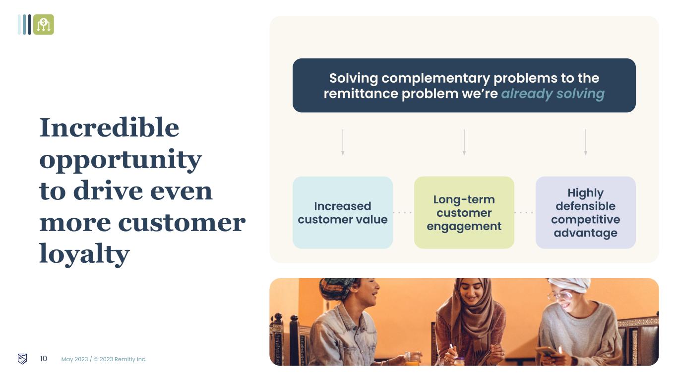 May 2023 / © 2023 Remitly Inc. 9 Building customer trust at scale Reliability Platform Availability 99.93%1 1. Remitly internal data for 1Q 2023. 2. Disbursement speed reflects the time between when Remitly has the customer funds and when the funds are successfully disbursed (e.g., completed or available for pickup) 3. App Store and Google Play ratings as of 3/31/23. 4.9X iOS App Store rating3 (~1M reviewers) 4.8X Android Google Play rating3 (+580k reviewers) Speed >90% of customer transactions disbursed in less than an hour1,2
