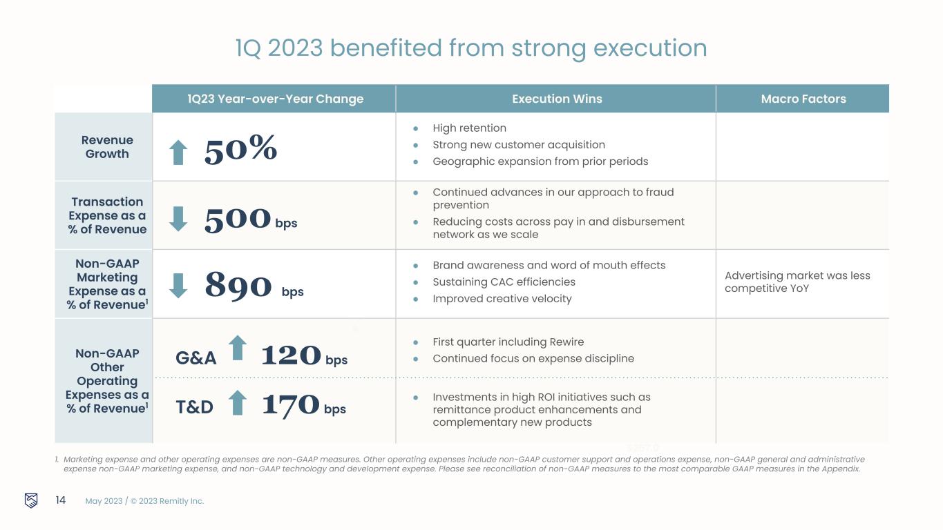 May 2023 / © 2023 Remitly Inc. 1Q — Continued strong execution SCALE 4.6m 50% growth in quarterly active customers over 1Q 2022 $8.5b 40% growth in send volume over 1Q 2022 REVENUE $204m 50% growth in revenue over 1Q 2022 13 PROFITABILITY ($28m) GAAP Net Loss $5.4m Adjusted EBITDA Adjusted EBITDA is a non-GAAP measure. Please see reconciliation of non-GAAP measures to the most comparable GAAP measures in the Appendix.