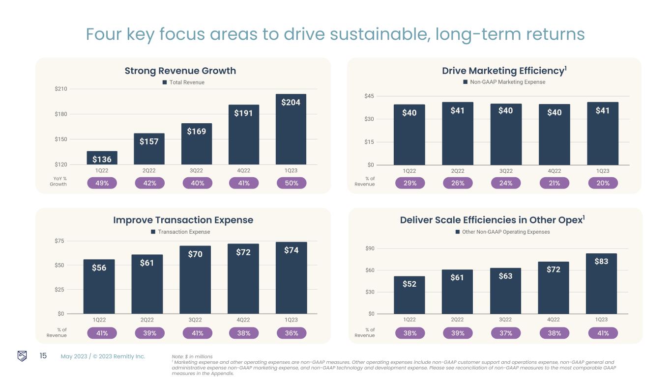 May 2023 / © 2023 Remitly Inc. 1. Marketing expense and other operating expenses are non-GAAP measures. Other operating expenses include non-GAAP customer support and operations expense, non-GAAP general and administrative expense non-GAAP marketing expense, and non-GAAP technology and development expense. Please see reconciliation of non-GAAP measures to the most comparable GAAP measures in the Appendix. $257.0 1Q23 Year-over-Year Change Execution Wins Macro Factors Revenue Growth 50% ● High retention ● Strong new customer acquisition ● Geographic expansion from prior periods Transaction Expense as a % of Revenue 500 bps ● Continued advances in our approach to fraud prevention ● Reducing costs across pay in and disbursement network as we scale Non-GAAP Marketing Expense as a % of Revenue1 890 bps ● Brand awareness and word of mouth effects ● Sustaining CAC efficiencies ● Improved creative velocity Advertising market was less competitive YoY Non-GAAP Other Operating Expenses as a % of Revenue1 G&A 120 bps T&D 170 bps 14 ● First quarter including Rewire ● Continued focus on expense discipline ● Investments in high ROI initiatives such as remittance product enhancements and complementary new products 1Q 2023 benefited from strong execution