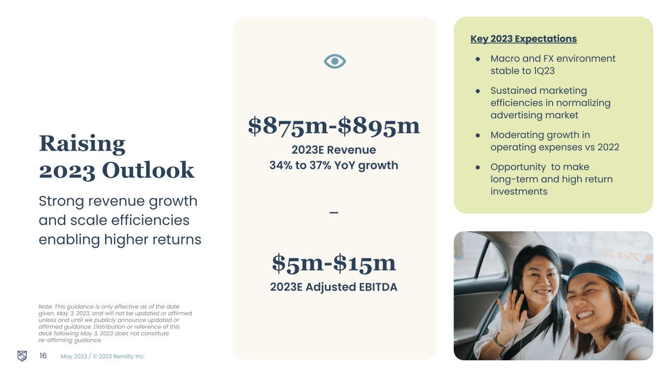 May 2023 / © 2023 Remitly Inc. 15 Deliver Scale Efficiencies in Other Opex1 Strong Revenue Growth Note: $ in millions 1 Marketing expense and other operating expenses are non-GAAP measures. Other operating expenses include non-GAAP customer support and operations expense, non-GAAP general and administrative expense non-GAAP marketing expense, and non-GAAP technology and development expense. Please see reconciliation of non-GAAP measures to the most comparable GAAP measures in the Appendix. YoY % Growth 49% 42% 40% 41% 50% Drive Marketing Efficiency1 % of Revenue 29% 26% 24% 21% 20% % of Revenue 41% 39% 41% 38% 36% Improve Transaction Expense % of Revenue 38% 39% 37% 38% 41% Four key focus areas to drive sustainable, long-term returns